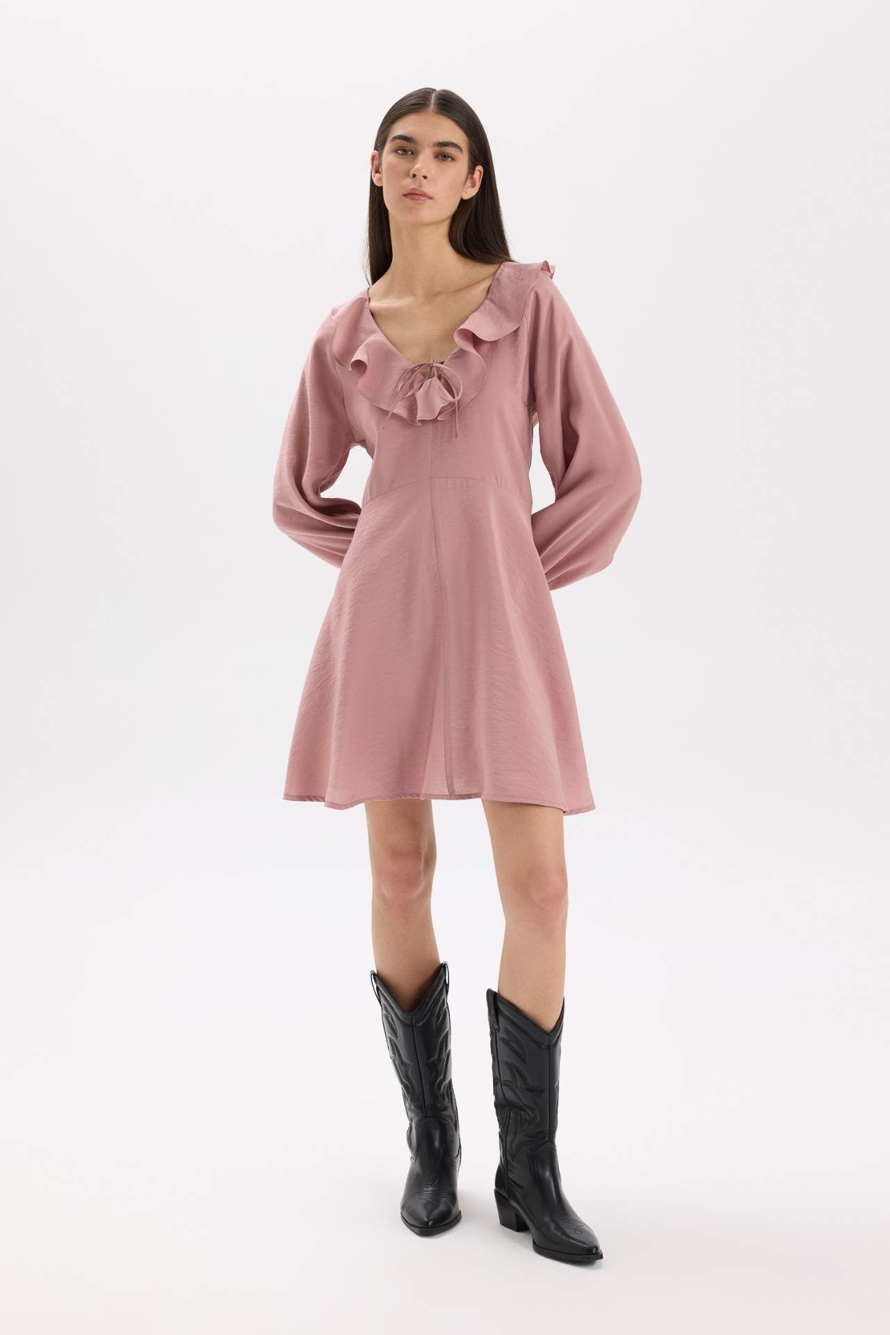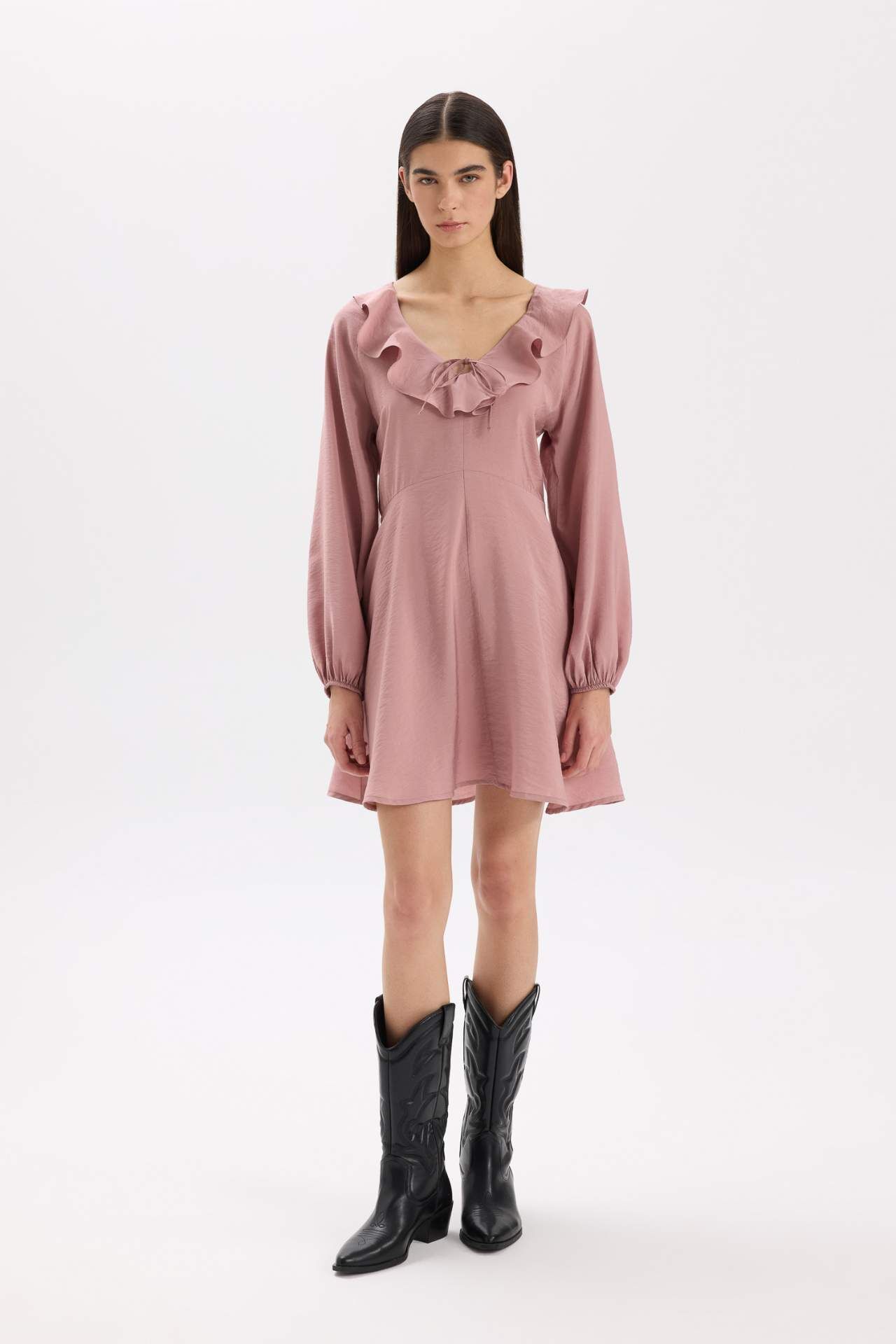 V Yaka Modal Uzun Kollu Mini Elbise
