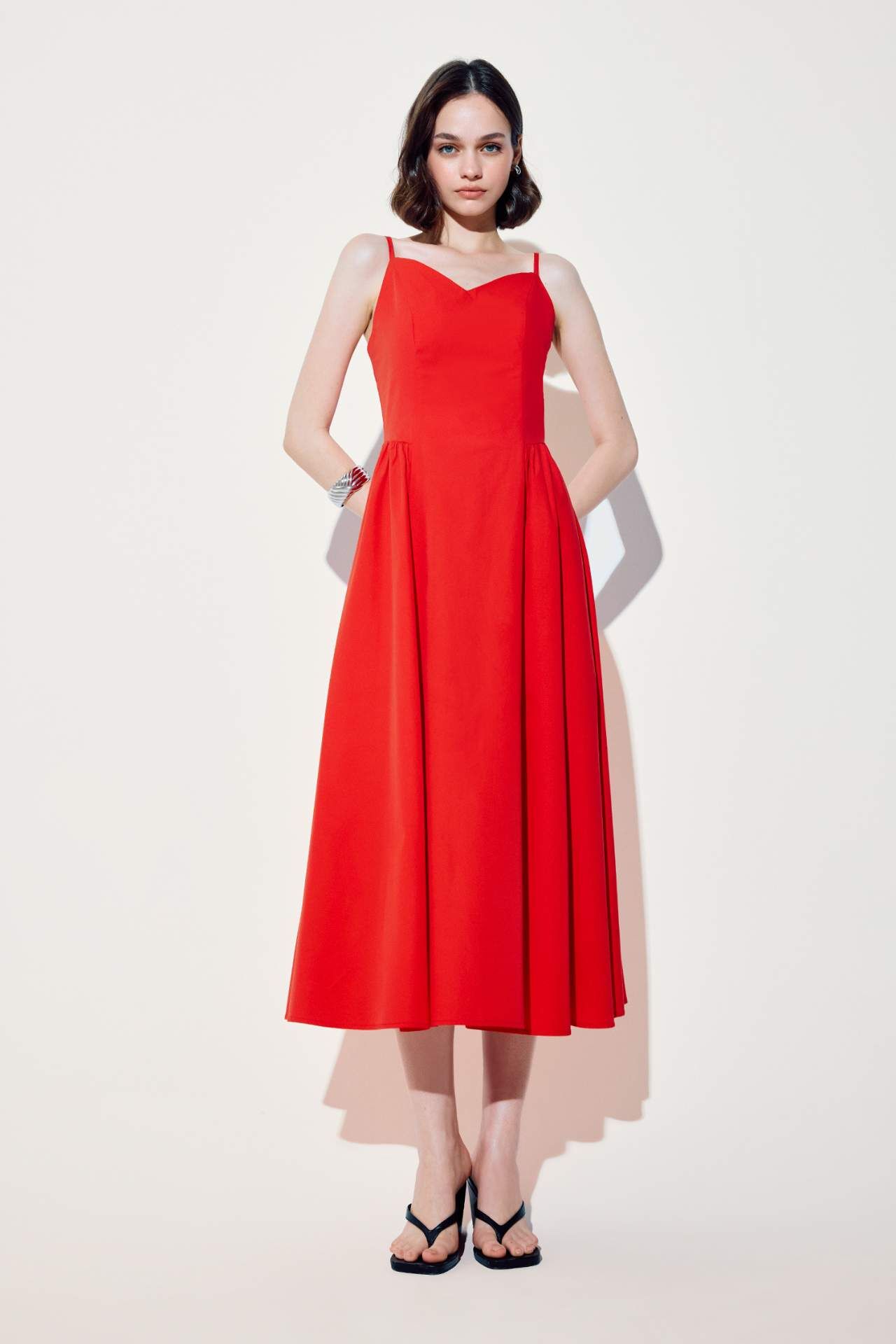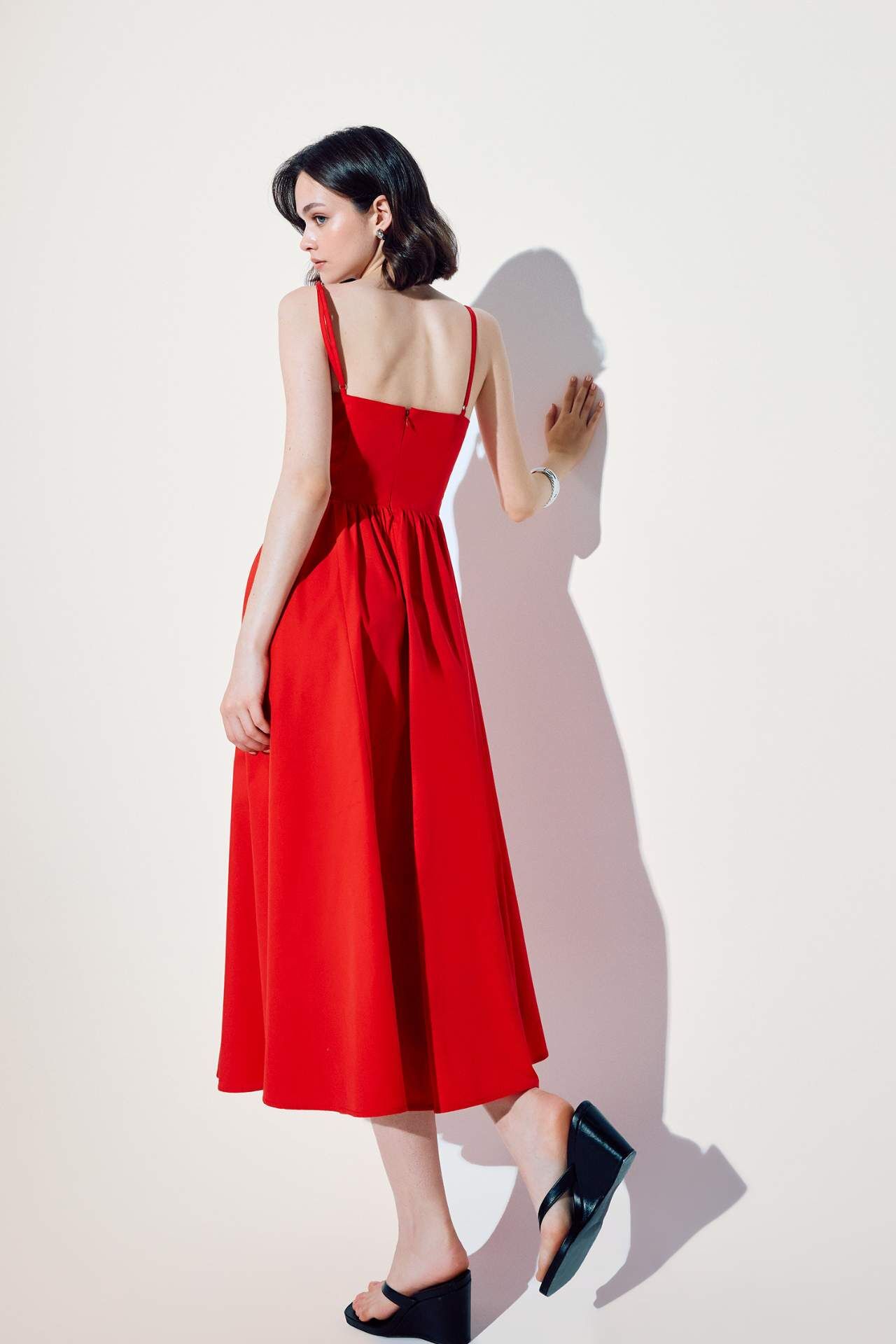 V Yaka Poplin Askılı Kırmızı Midi Elbise