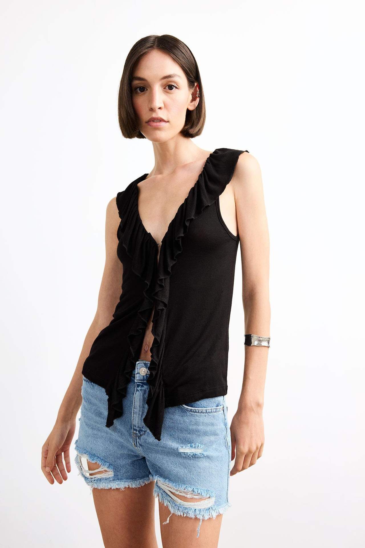 V Yaka Volanlı Viskon Kolsuz Bluz G0401AX25SMBK81