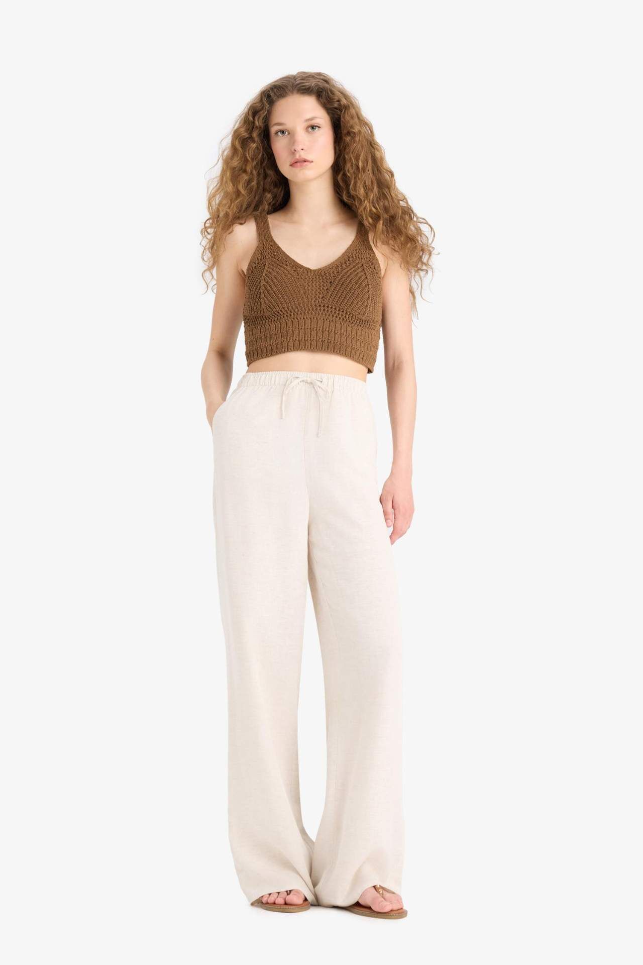 DeFacto Wide Leg Cepli Yüksek Bel Standart Boy Keten Karışımlı Pantolon F5024AX25SPBG155