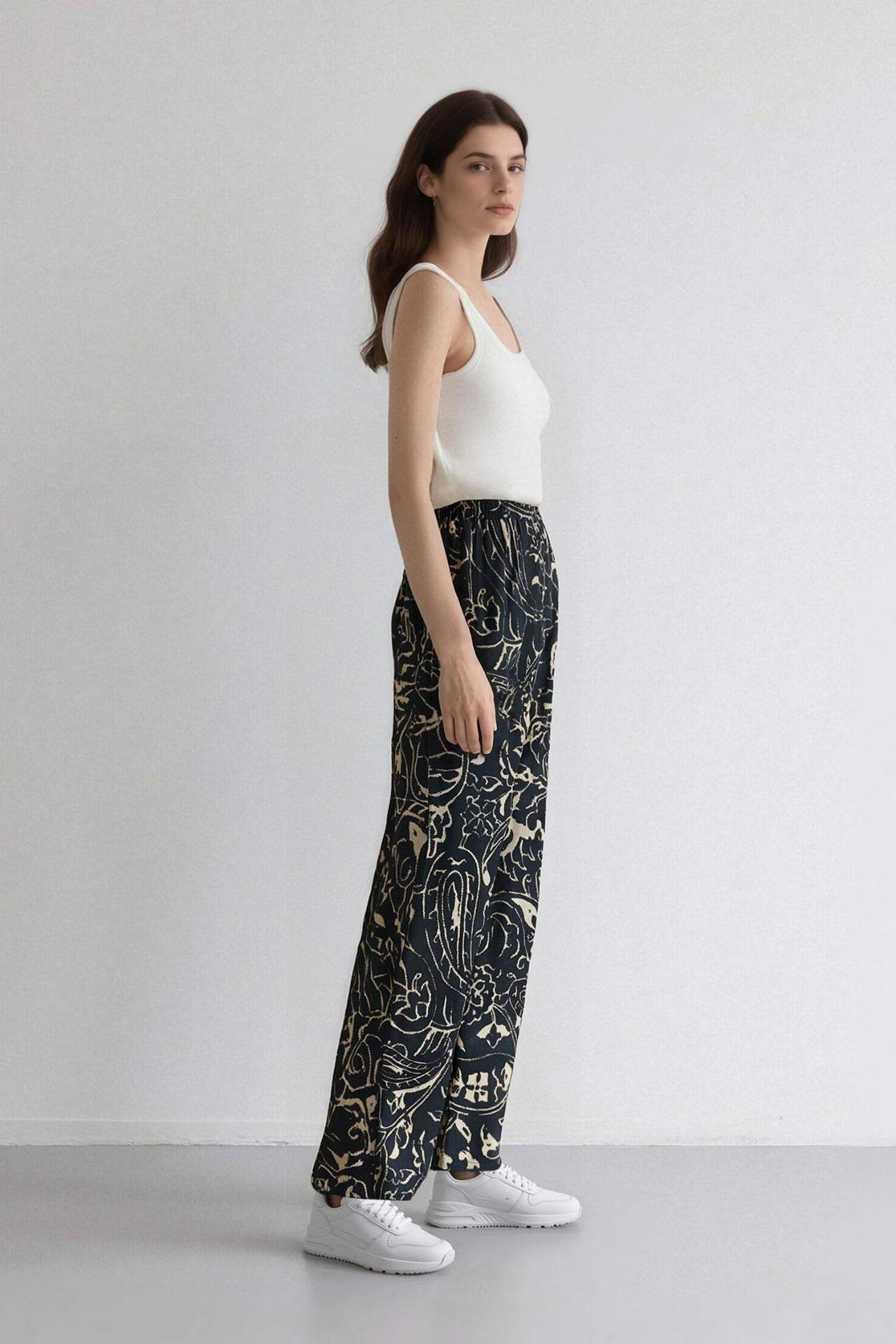 Yetişkin kadınlar için yaz mevsimine uygun, yüksek bel baskılı wide leg dokuma pantolon. Lacivert renk ve lastikli kapama detayıyla, temel çeşit kadın pantolonları arasında öne çıkıyor. Her tarza uygun olan bu pantolon, şıklığı ve rahatlığı bir arada sunuyor. Poliamid 15%,Viskoz 85%,Poliamid 15%,Viskoz 85%,Poliamid 15%,Viskoz 85%,Poliamid 15%,Viskoz 85%,Poliamid 15%,Viskoz 85% Manken Bedeni: Göğüs: 0 Boy: 1,75 Basen: 0 Bel: 0