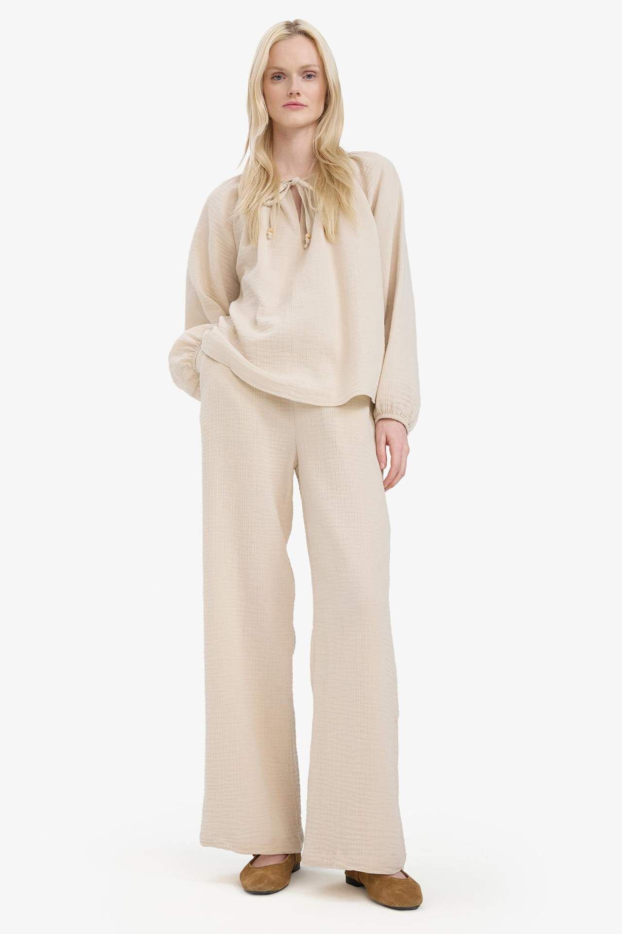 Yetişkinler için yüksek bel dokuma pantolon. Geniş paça ve lastikli kapama detayı ile rahatlık ve şıklığı bir arada sunar. Müslin kumaşıyla yaz mevsiminde tercih edilen bej rengi. Kadınların temel çeşit ihtiyaçları için ideal bir seçim. Pamuk 100%,Pamuk 100%,Pamuk 100%,Pamuk 100%,Pamuk 100% Manken Bedeni: Göğüs: 78 Boy: 1,78 Basen: 89 Bel: 61