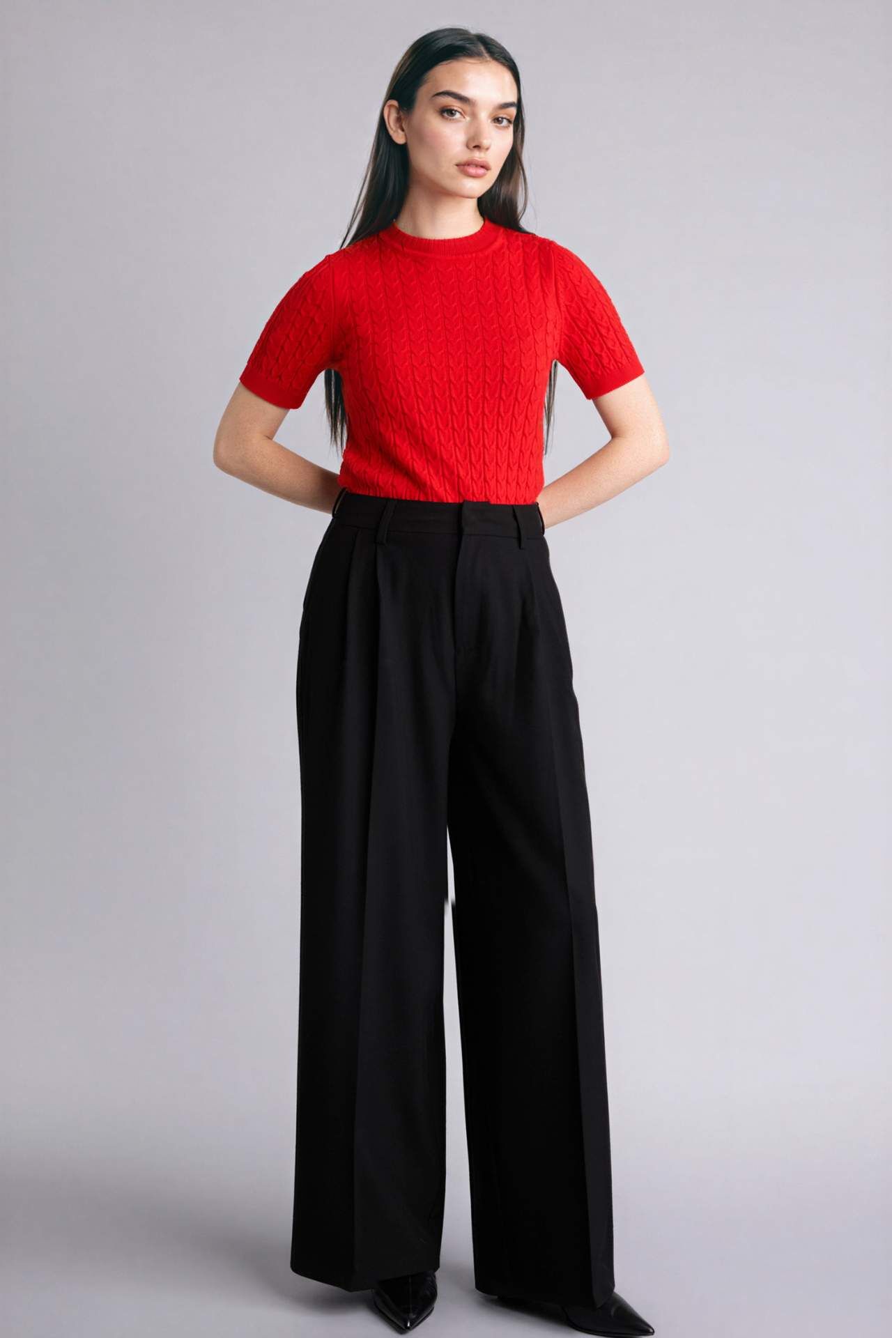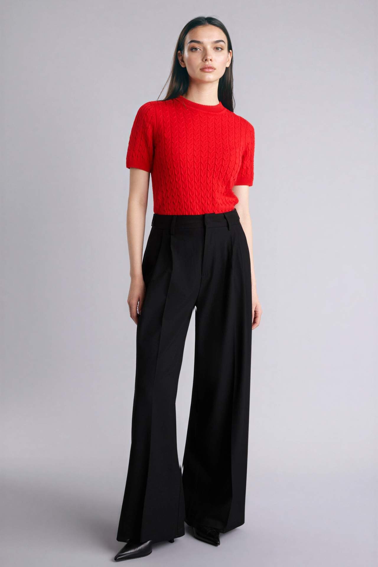 Wide Leg Yüksek Bel Geniş Paça Pantolon, yüksek bel tasarımıyla bel hattını vurgularken, geniş paça kesimiyle modern ve şık bir siluet sunar. Rahat ve akıcı kumaşı sayesinde gün boyu konfor sağlar. Hem günlük hem de özel kombinlerde stilinize zarif bir dokunuş katar. Elastan 2%,Viskoz 37%,Poliester 61% Manken Bedeni: Göğüs: 85 Boy: 1,77 Basen: 89 Bel: 62
