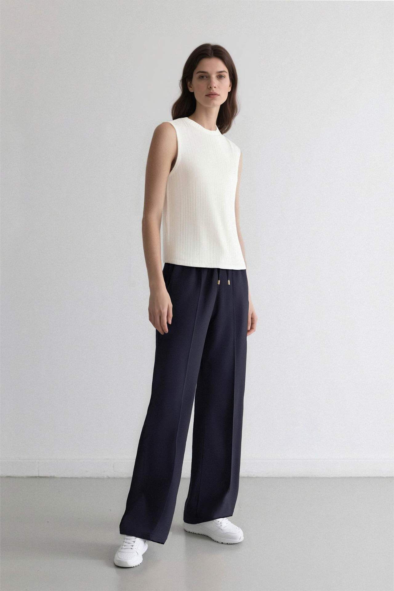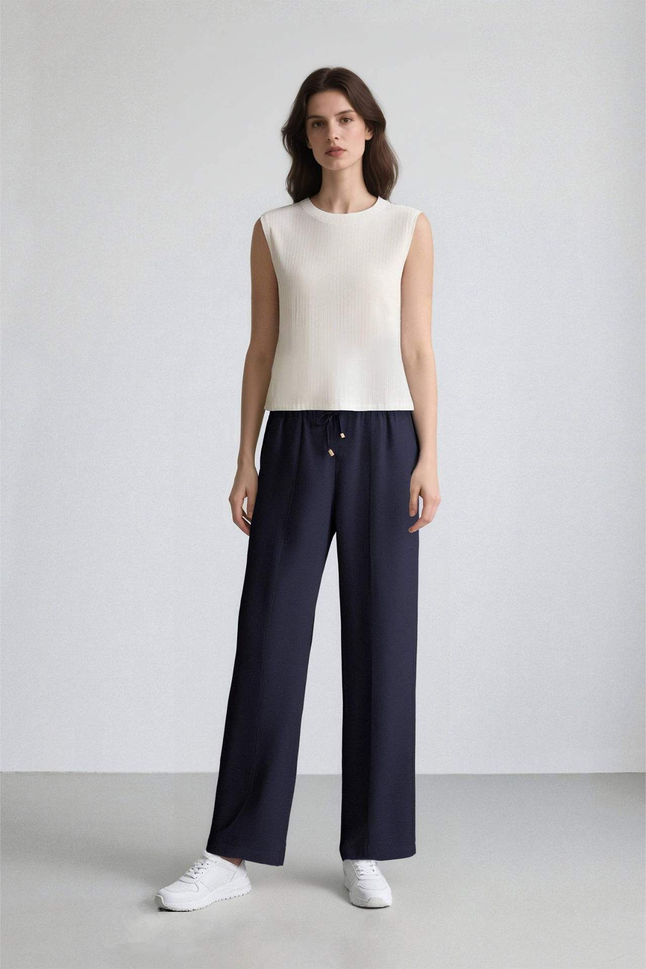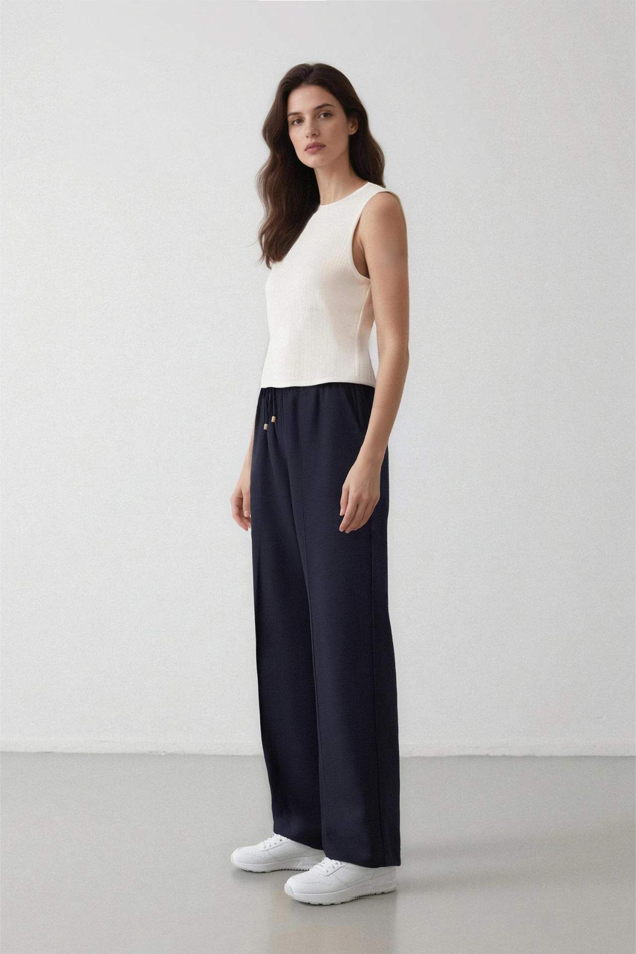 Wide straight kesimi ve düz paçasıyla modern bir görünüm sunan pantolon, beli lastikli ve bağcıklı tasarımıyla rahat kullanım sağlar. Cepleri pratiklik katar ve gün boyu konfor sunar. Poliamid 15%,Viskoz 85% Manken Bedeni: Göğüs: 0 Boy: 1,75 Basen: 0 Bel: 0