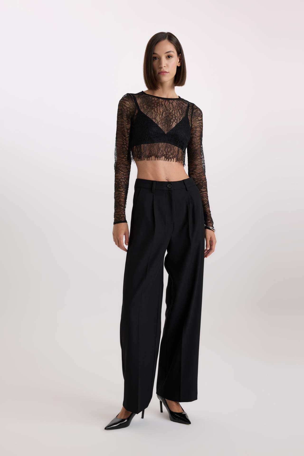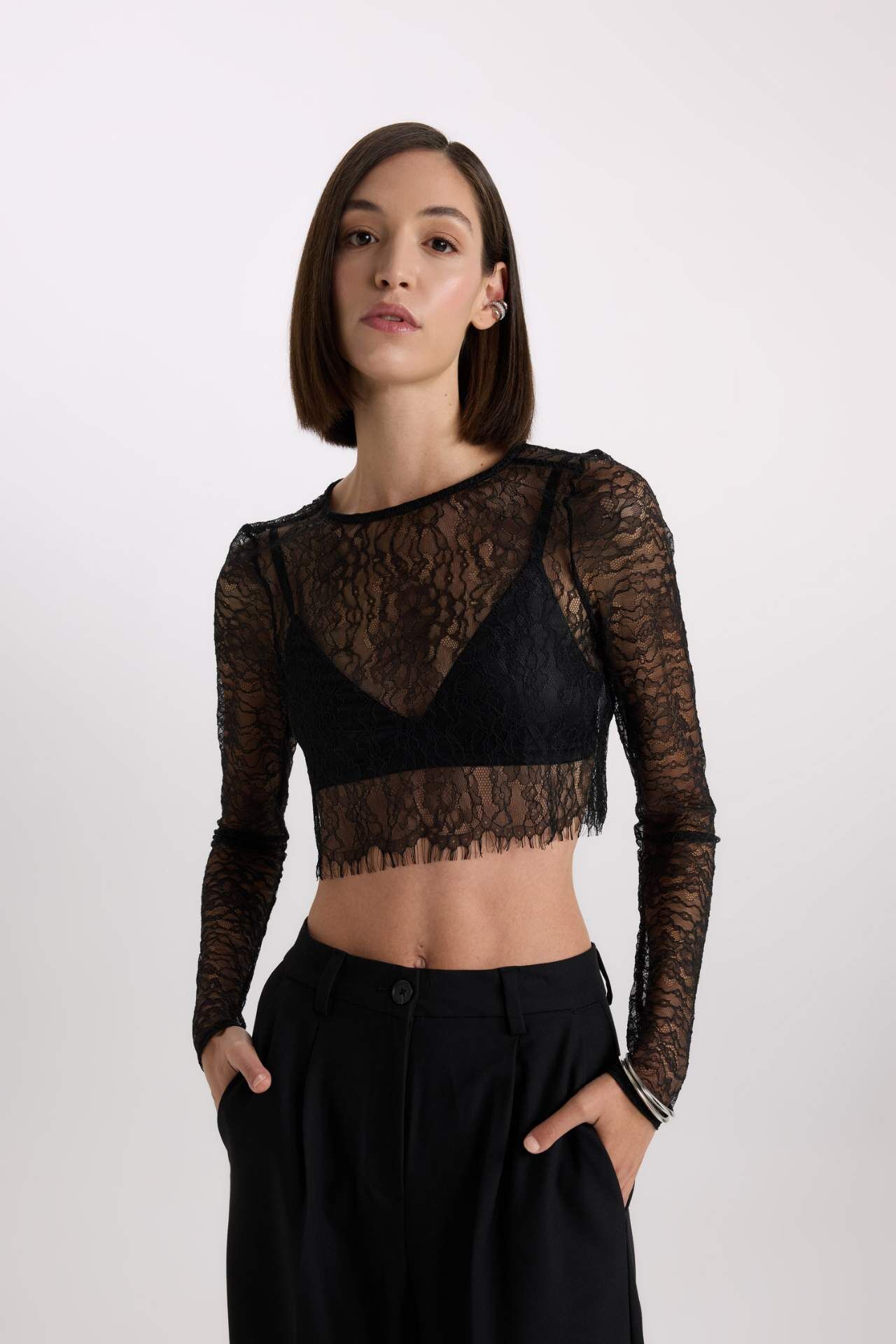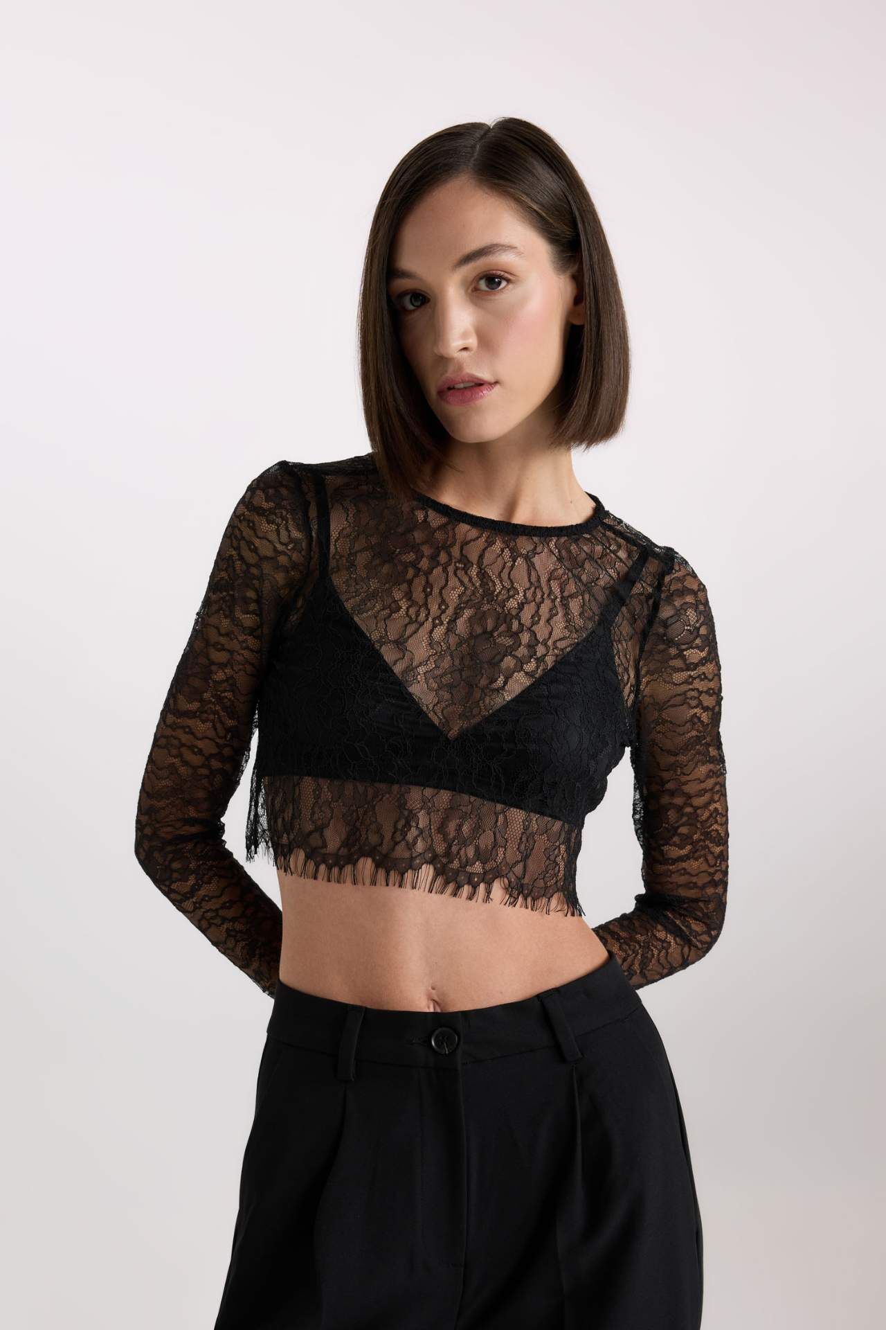 Crop Yuvarlak Yaka Dantel Uzun Kollu Bluz: Zarif ve şık bir seçenek. Bu crop bluz, dantel detaylarıyla öne çıkıyor. Uzun kollu tasarımıyla soğuk havalarda sıcak tutarken, yuvarlak yaka kesimiyle modern bir görünüm sunuyor. Partilerde veya özel günlerde şıklığınızı tamamlamak için ideal. Poliamid 100%,Poliamid 100% Manken Bedeni: Göğüs: 83 Boy: 1,81 Basen: 90 Bel: 58
