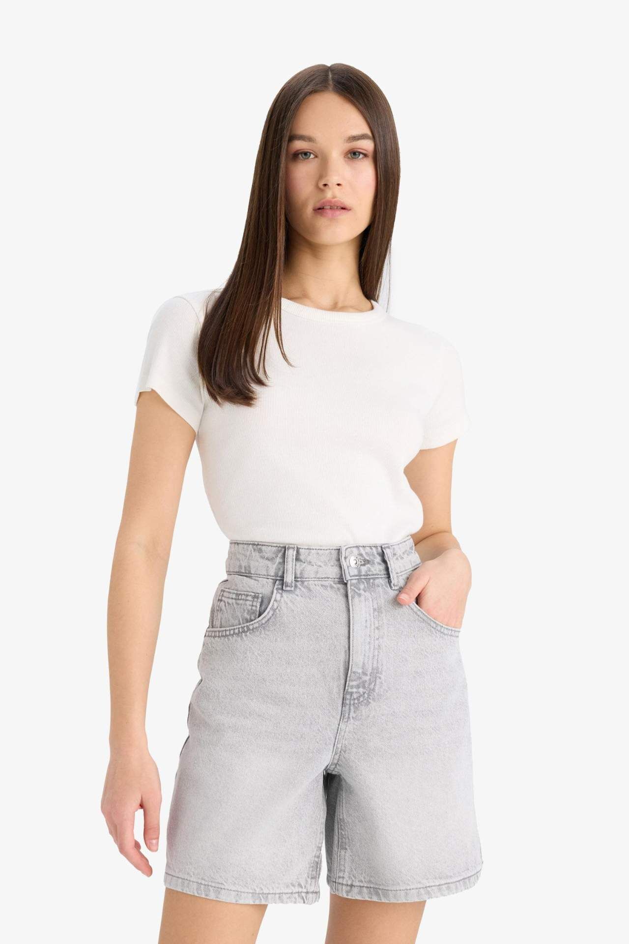 Yüksek bel tasarımı ve cepli modeliyle bu jean bermuda şort, hem rahat hem de şık bir görünüm sunar. Dayanıklı dokusuyla günlük kullanım için ideal bir tercihtir. Pamuk 100%,Pamuk 100%,Pamuk 100%,Pamuk 100%,Pamuk 100%,Pamuk 100%