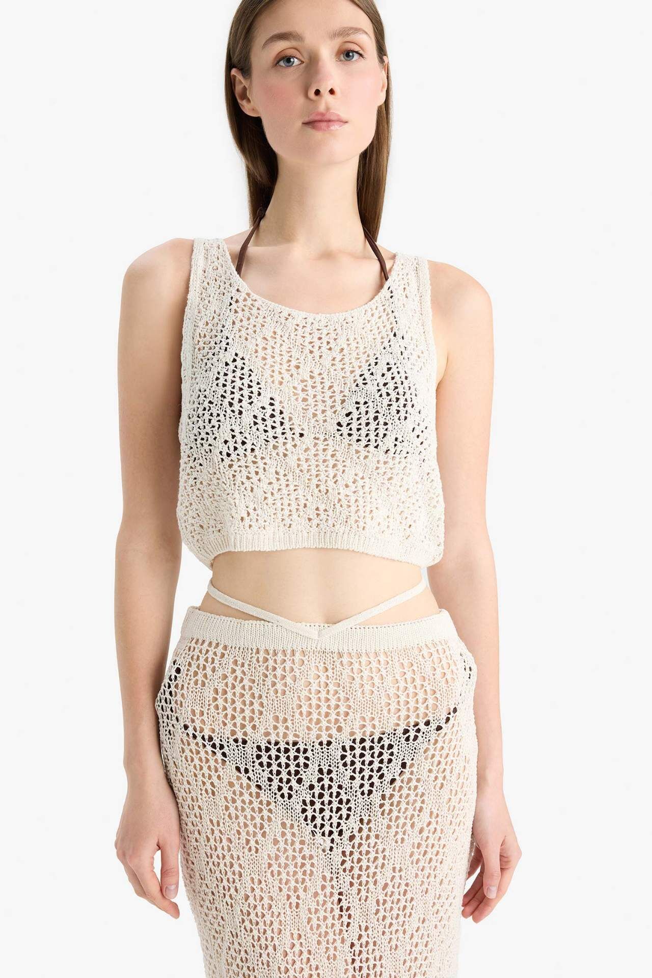 Yuvarlak Yaka Crop Kolsuz Triko Beyaz Plaj Üstü-Fall in Love