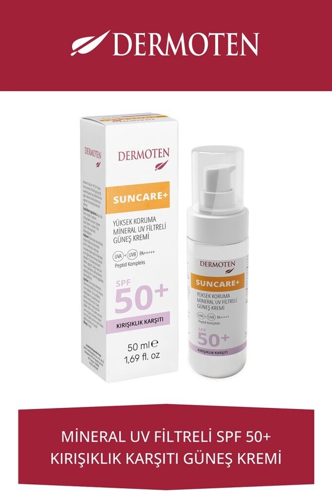 Dermoten SunCare+ SPF 50+ Kırışıklık Karşıtı Mineral UV Filtreli Güneş Kremi, mineral UV filtreli güçlü içeriği sayesinde güneşe karşı yüksek koruma sağlar. Kırışıklık karşıtı olarak kullanılabilir. Dermatolojik olarak test edilmiştir.