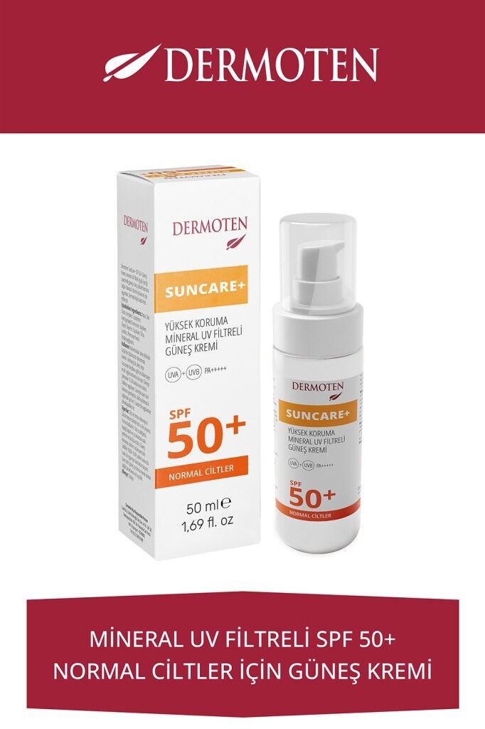 Dermoten SunCare+ SPF 50+ Güneş Kremi, mineral UV filtreli güçlü içeriği sayesinde güneşe karşı yüksek koruma sağlar. Normal ciltlerin kullanımı için uygundur. Dermatolojik olarak test edilmiştir.
