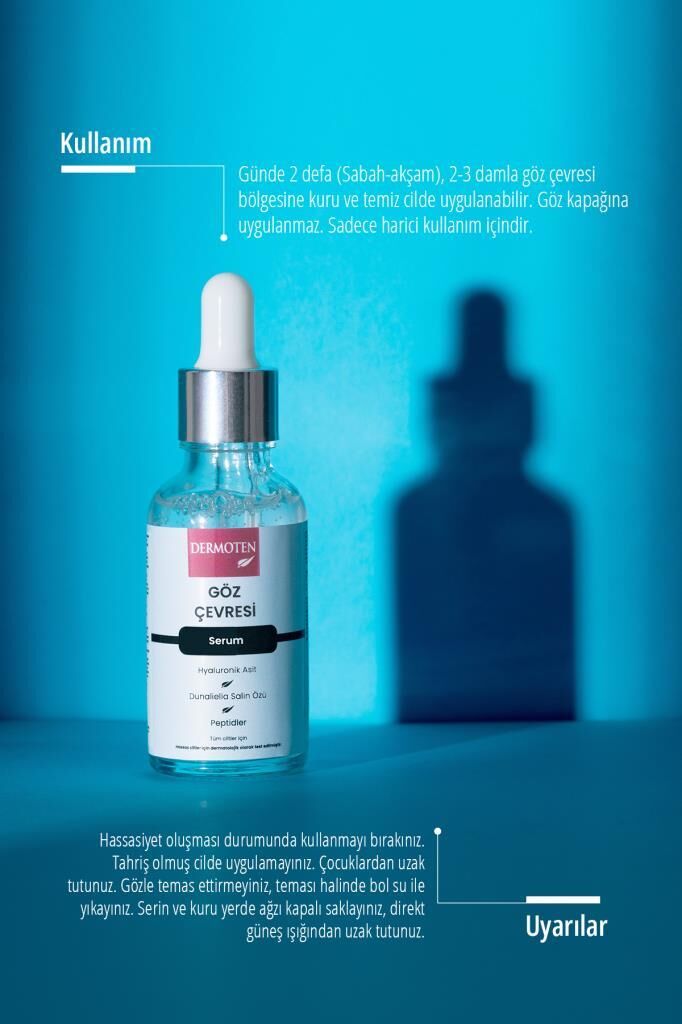 Dermoten Göz Çevresi Bakım Serumu, göz çevresinin nemihtiyacını karşılarken, göz çevresinin canlı ve sıkı görünümünü desteklemeyeyardımcı olur.
