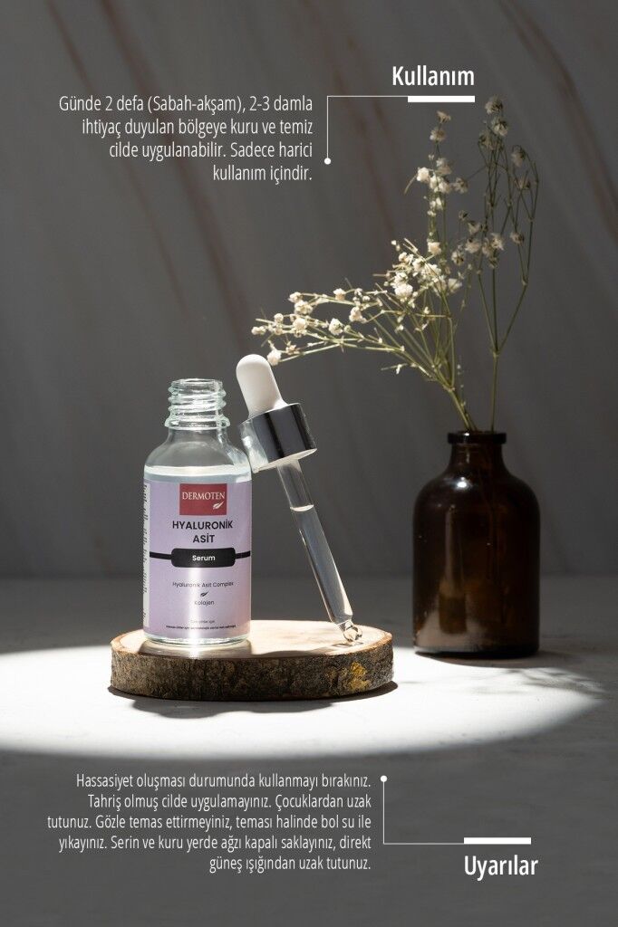 Dermoten Hyaluronik Asit Serum, İçeriğinde bulunan 5farklı çeşit Hyaluronik asit ve kolajen ile cildi nemlendirir ve cilde bakımyapar.