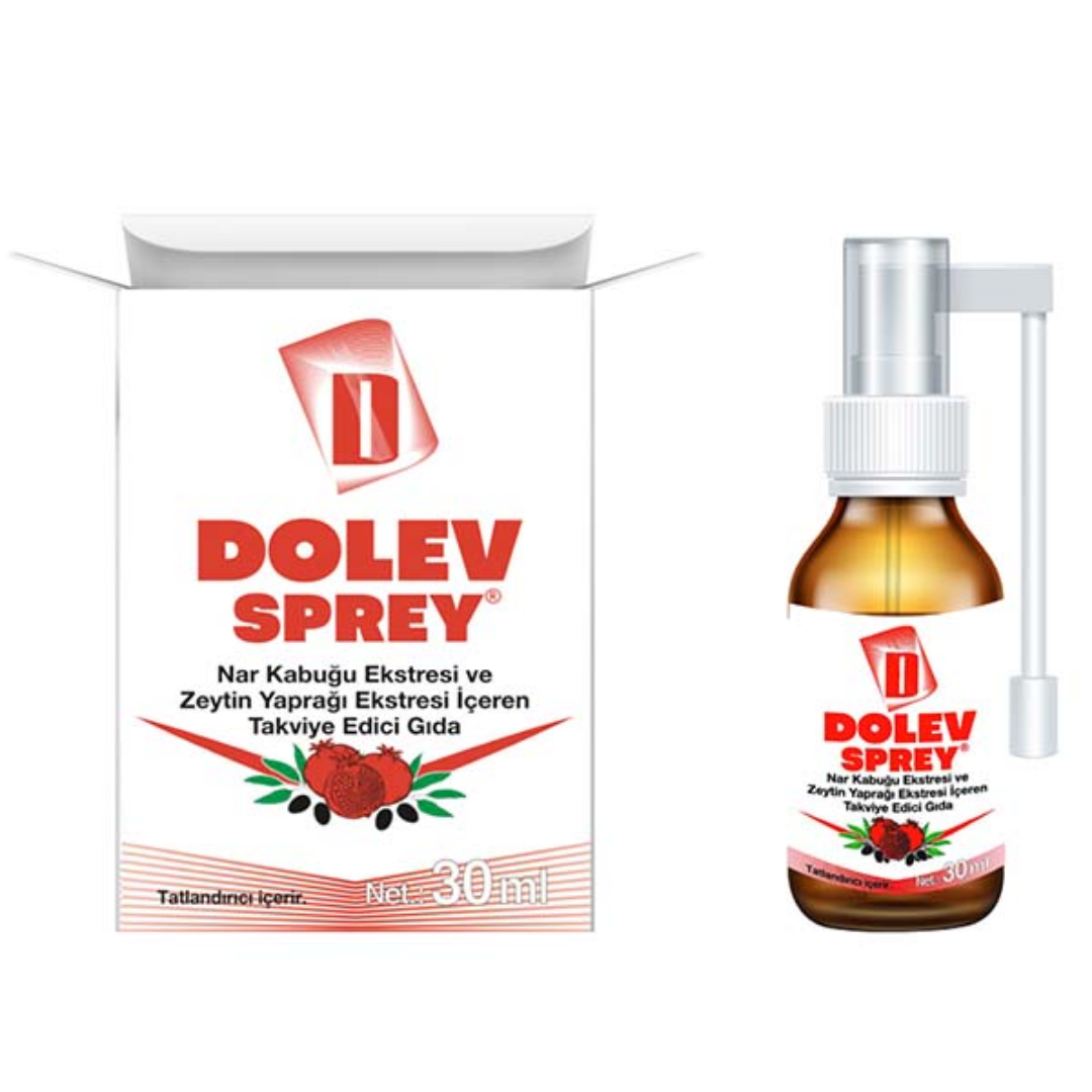 Dolev Sprey içeriğine gallik asidden zengin nar kabuğu ekstresi ve oleuropeinden zengin zeytin yaprağı ekstresi (ZYE) içeren bir ek gıda takviyesidir.