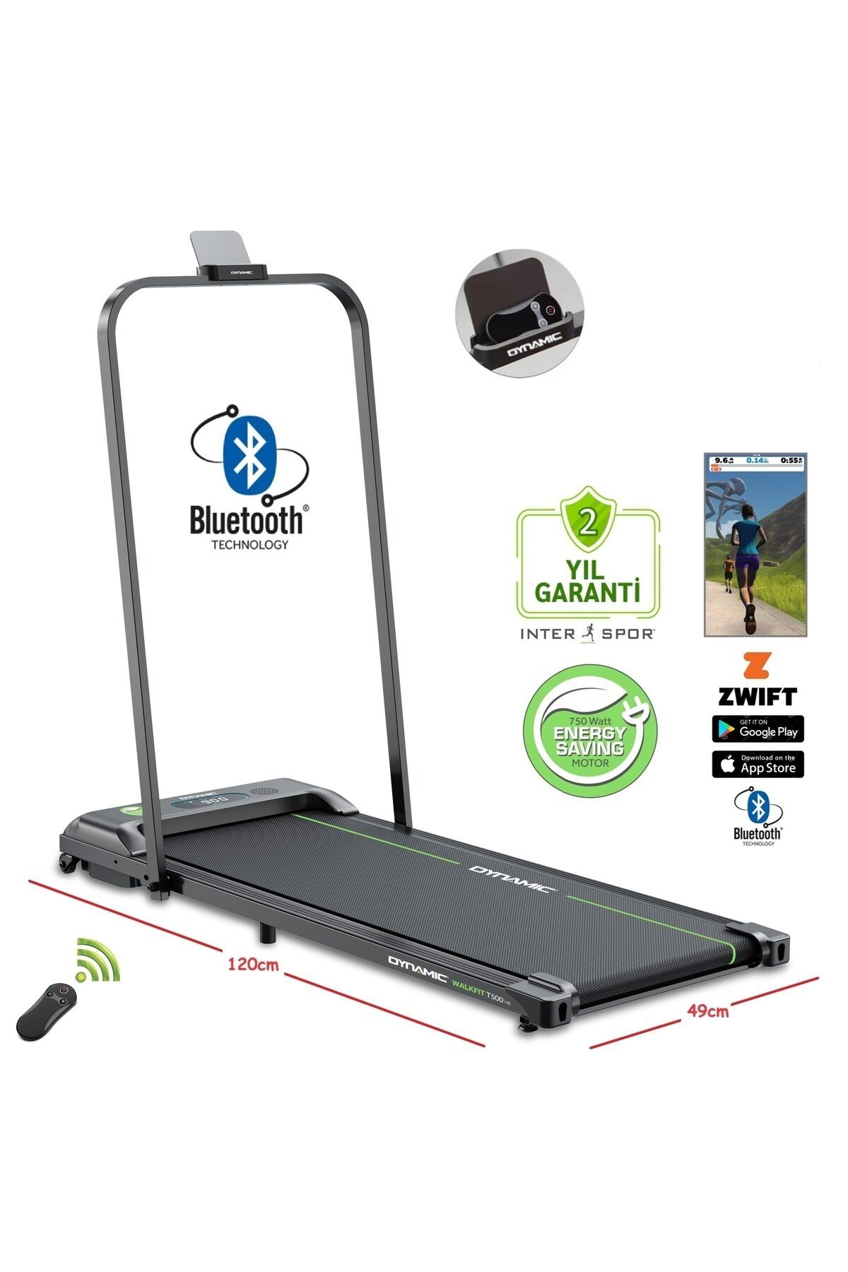 Dynamic Walkfitpad T500, Bluetooth bağlantısıyla müzik dinlemenizi sağlayan hoparlörleri ve enerji tasarruflu özelliği ile dikkat çekiyor. Uzaktan kumanda ile rahat bir kullanım sunan bu koşu bandı, koşu deneyiminizi daha keyifli hale getiriyor.