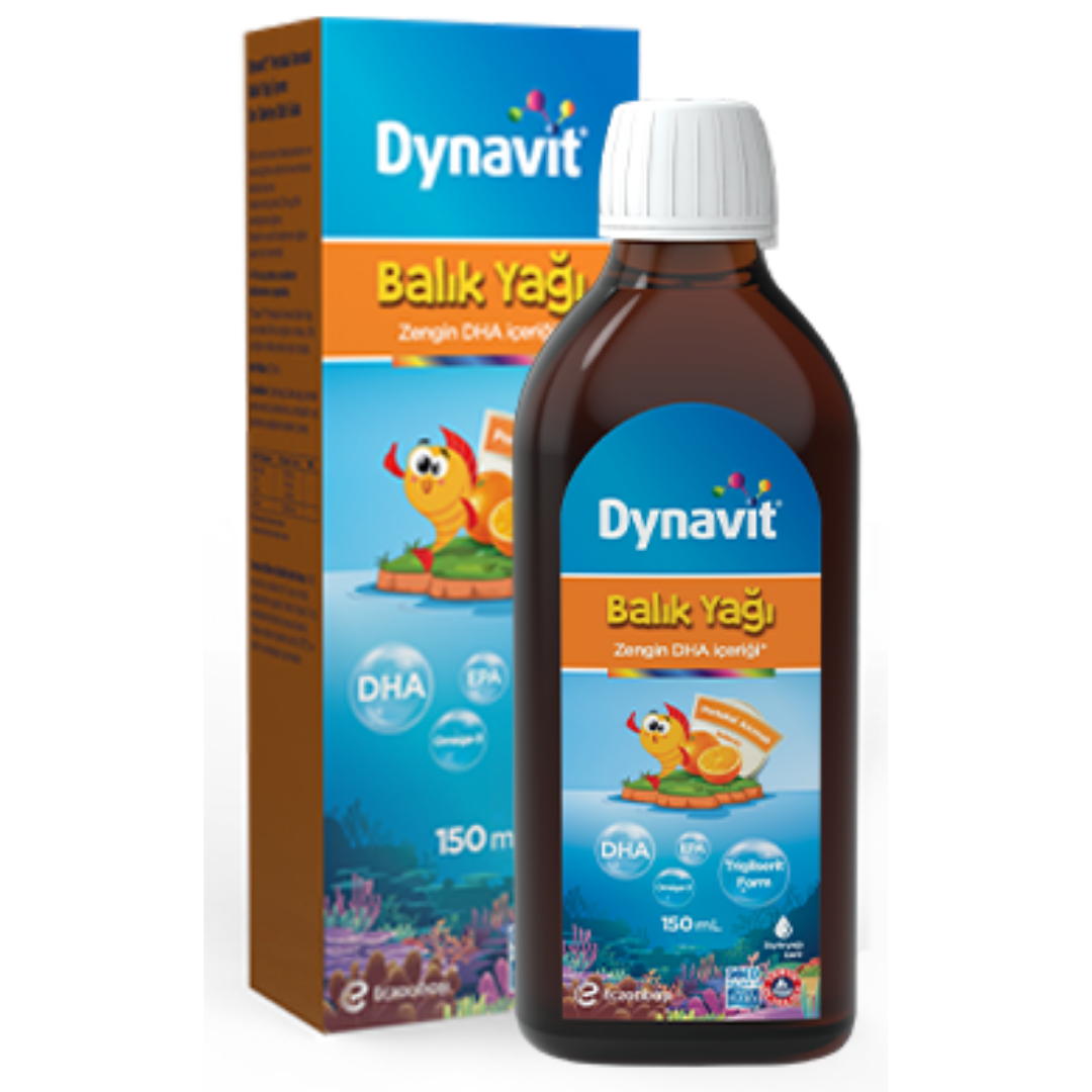 AKTİF BİLESEN 5ml'de Balık Yağı 1.300 mg DHA 650 mg EPA 195 mg Stevia rebaudiana (Stevya yaprak ekstresi) 0,87 mg DYNAVİT Portakal