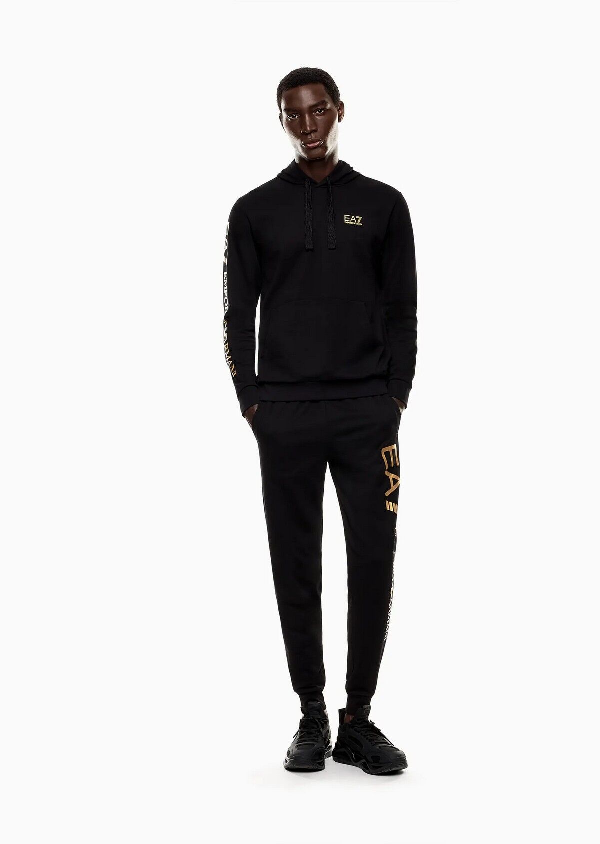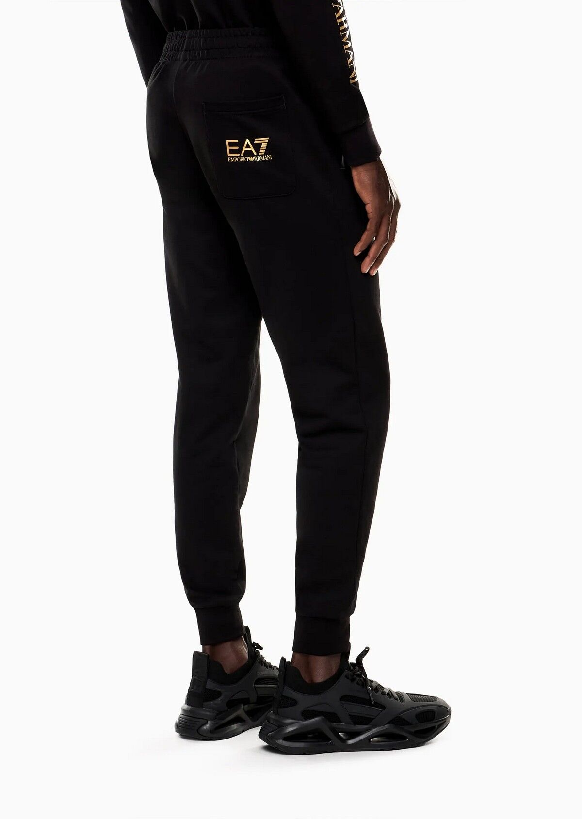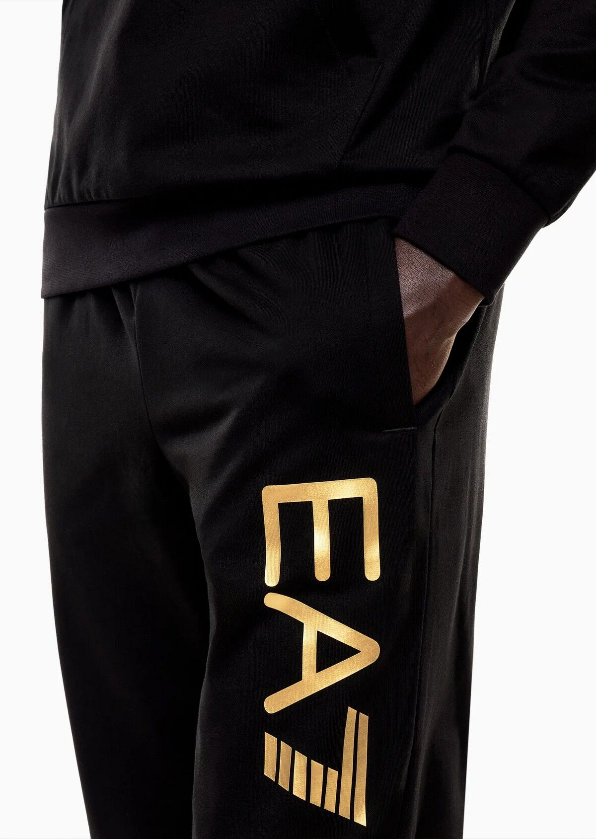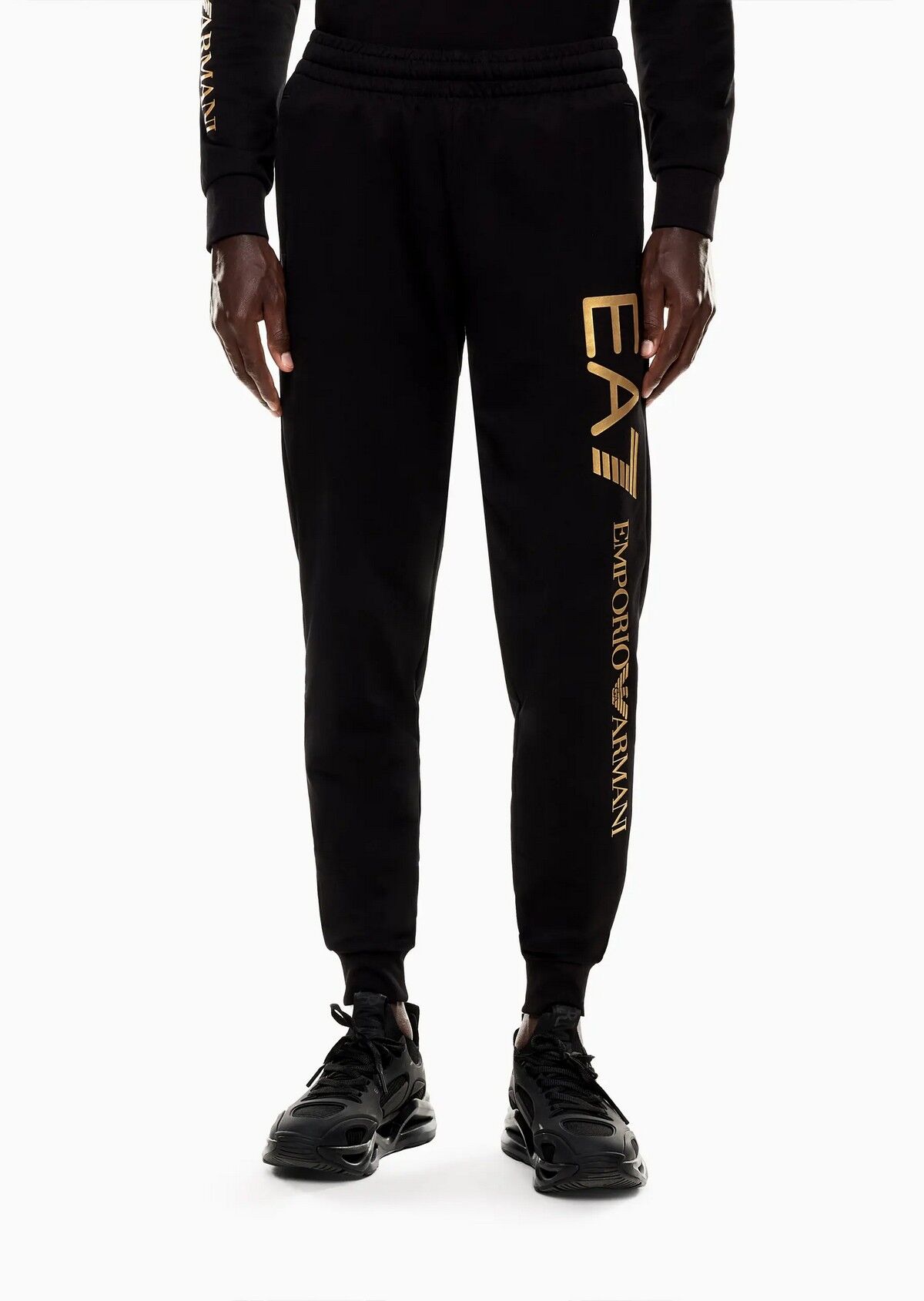 EA7 Logo Serisi Pantolon, siyah ve altın rengi Yumuşak pamuklu eşofman altı, spor salonundan açık hava antrenmanlarına kadar çok yönlü kombinler için mükemmeldir. Normal kesim, koleksiyondaki diğer parçaları yansıtan sağ tarafta metalik bir logo detayıyla kişiselleştirilmiştir. Malzeme: %100 Pamuk