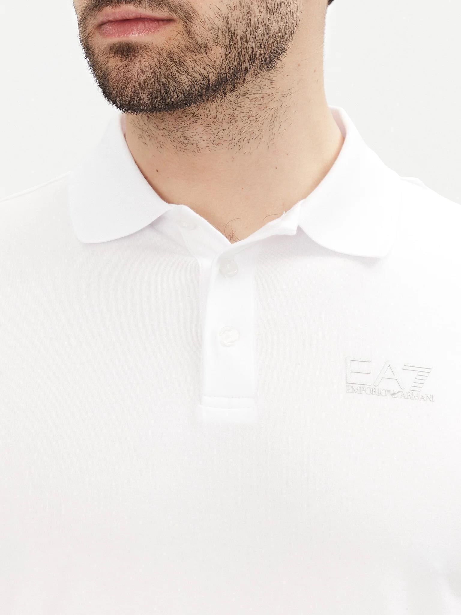 EA7 Emporio Armani markalı, jarse kumaştan üretilmiş erkek polo tişörtü. Pamuklu, jarse kumaş Klasik nervürlü polo yaka Üç düğmeli patlet Göğüs kısmında beyaz logo Kısa kollu Ribana manşetler Arka etek ucunda özgün baskı Dar kesim %95 Pamuk, %5 Elastan