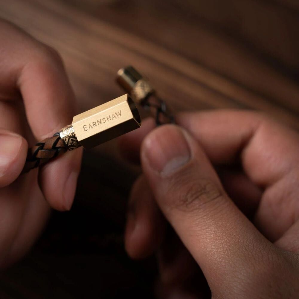 MALZEME : Hakiki Deri ve Paslanmaz Çelik - RENK : Kahverengi ve Altın - KOL DÜĞMESİ ÖLÇÜLERİ : Maksimum Çap 65 mm - ÖZELLİKLER : Manyetik Toka Kazınmış Earnshaw Logosu