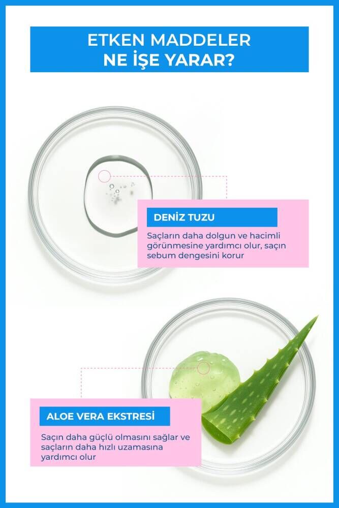 - Saçlarınıza doğal bir hacim ve dolgunluk kazandırmak için ideal, deniz tuzu ve panthenol içeren formülüyle saçlarınızı şekillendirirken aynı zamanda besler; - Kullanımı kolaydır; nemli veya kuru saçınıza uygulayarak dilediğiniz gibi şekillendirme yapabilirsiniz; - Saçlarınızı doğal kurumaya bırakabilir veya isterseniz ısı uygulayarak daha belirgin bir hacim elde edebilirsiniz; - Saçınıza ekstra hacimli bir görünüm katmak için nemli saçın diplerine uygulayıp kurutmanız yeterlidir; - Durulama gerektirmez, günlük kullanım için uygundur ve pratikliğiyle öne çıkar; - Orta tutuculuk seviyesi sayesinde saçlarınızın doğal dengesini bozmadan istediğiniz şekillendirmeyi yapmanızı sağlar;