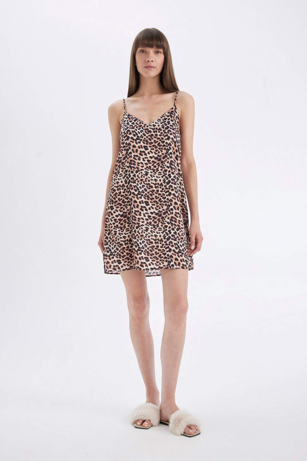 DeFactoFit Fall in Love Leopar Desenli V Yaka Saten Askılı Gecelik