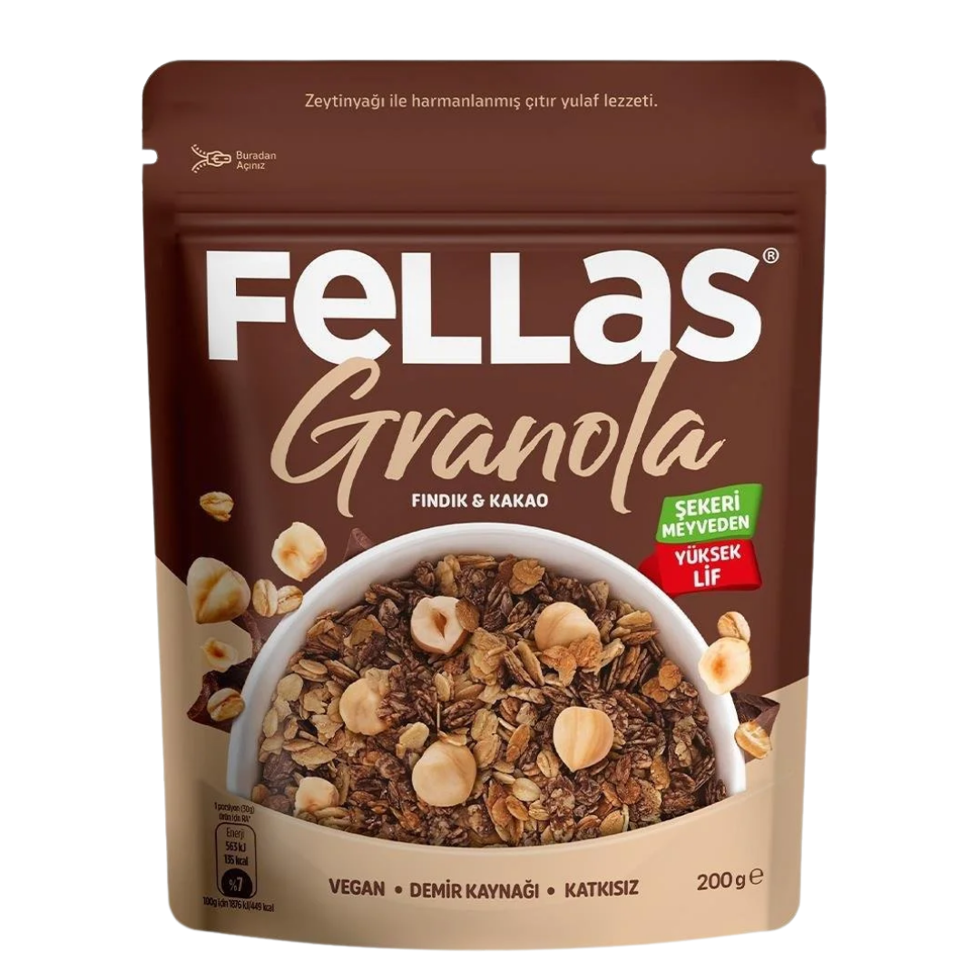 İçindekiler : Yulaf ezmesi (%57), fındık(%15), Fellas fındıklı ve kakaolu meyve bar parçaları (hurma, fındık (%15), nohut unu, kakao tozu (%7), kakao kitlesi (%5), inülin) (%10), elma suyu konsantresi, hurma suyu, sızma zeytinyağı.