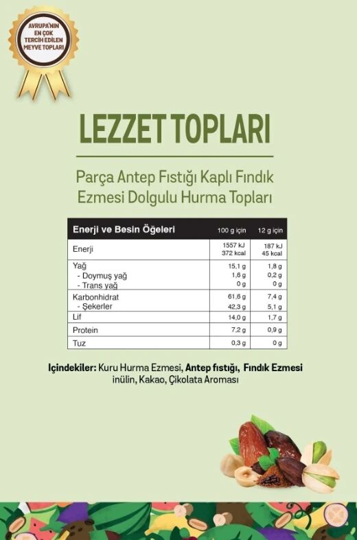 İçeriğinde %63,8 kuru hurma ezmesi, %15 Antep fıstığı ve %12 fındık ezmesi bulunmaktadır. Eser miktarda ceviz, yer fıstığı, badem, kaju, susam, kükürt dioksit ve glüten içerebilir.
