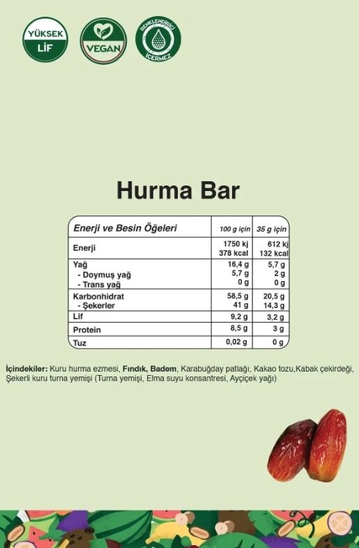 FitFit Hurma Bar, %58,5 kuru hurma ezmesi, %12 fındık ve %12 badem ile zenginleştirilmiştir. Ayrıca, karabuğday patlağı, kakao tozu ve kabak çekirdeği gibi besleyici bileşenler içermektedir. Her 35 gramlık porsiyonda 612 kJ enerji, 5,7 g yağ, 3 g protein ve 20,5 g karbonhidrat bulunmaktadır. Lif oranı ise 3,2 g’dır, bu da sindirim sağlığına katkıda bulunur.