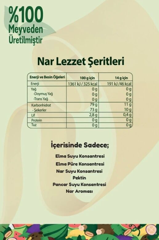 FiTFit Nar Lezzet Şeriti, doğal meyve pestili formunda, sağlıklı bir atıştırmalık olarak öne çıkmaktadır. %100 meyveden üretilen bu ürün, ilave şeker, renklendirici ve koruyucu maddeler içermemektedir. Elma suyu konsantresi ve gerçek nar suyu ile zenginleştirilmiş olan bu lezzet şeridi, ferah ve meyvemsi bir tat sunarak, hem çocuklar hem de yetişkinler için ideal bir atıştırmalık alternatifi oluşturmaktadır.