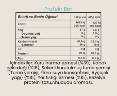 Yoğun yaşam temposuna ve spor rutinine doğal destek sağlayan FitFit Protein Bar, yüksek protein içeriği ile kas gelişimini desteklerken, temiz içerikli formülüyle günün her anında sağlıklı bir enerji kaynağı sunmaktadır. Her bir 50 gramlık bar, dengeli beslenme hedeflerinize katkıda bulunmak üzere tasarlanmıştır.
