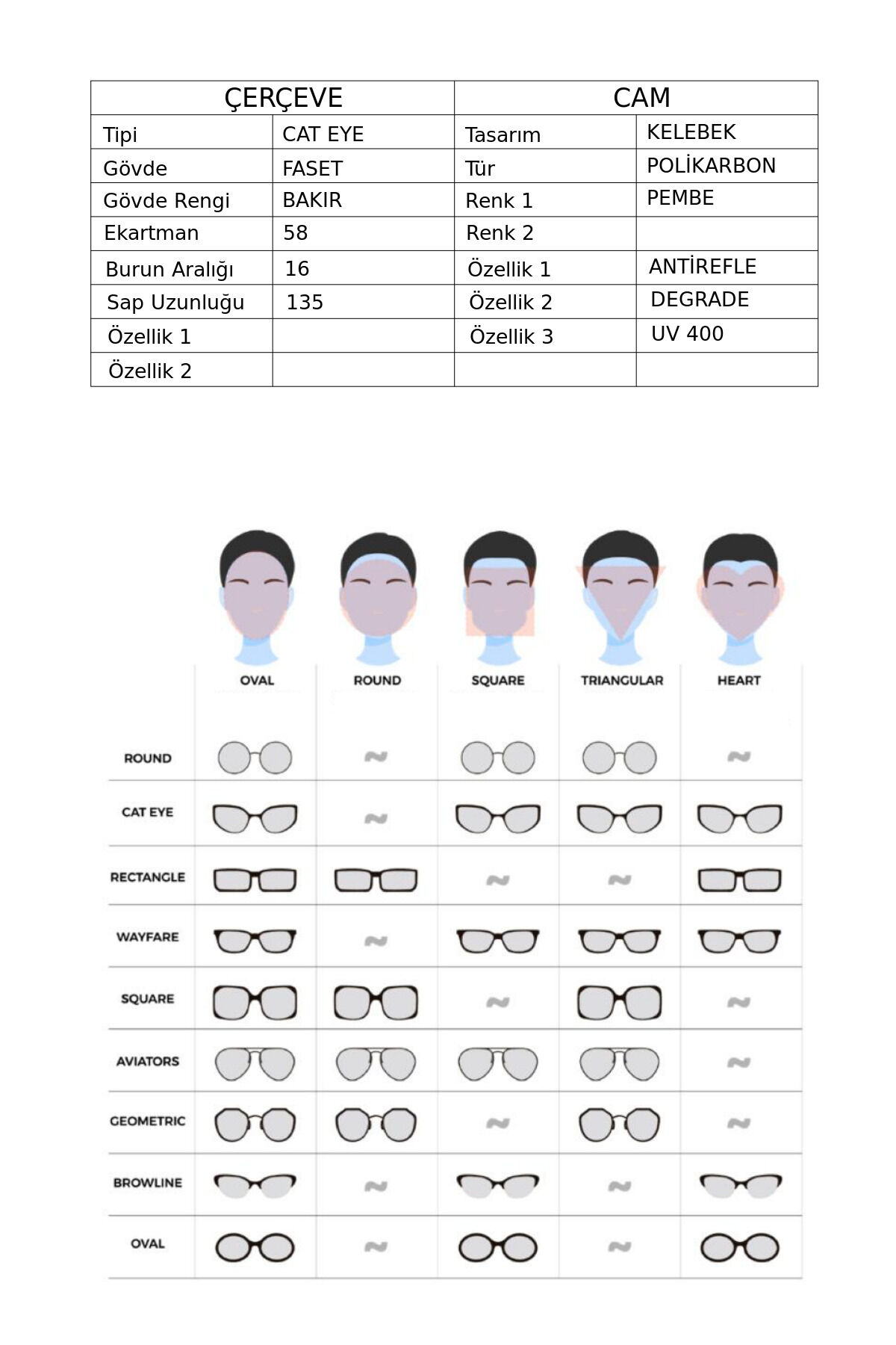 geri gönderim yaparken paketi size geldiği şekilde (Kılıfı, Silme Bezi, Garanti Belgesi ve Faturası ile) göndermeye dikkat etmelisiniz.Özellik Adı Özellik Değeri Tipi .: CAT EYE Gövde.: FASET Gövde Rengi.: BAKIR Ekartman.: 58 Burun Aralığı.: 16 Sap Uzunluğu.: 135 Çerçeve Özellik.: .: Cam Tasarımı.: KELEBEK Cam Türü.: POLİKARBON Cam Özellik.: ANTİREFLE .: DEGRADE .: UV400 Cam Rengi.: PEMBE .: MAVİ
