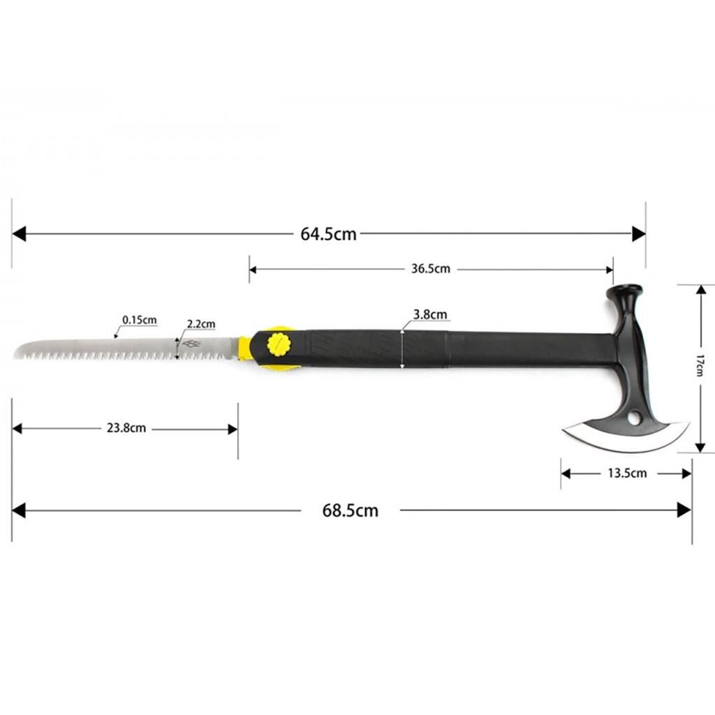 Testerenin toplam uzunluğu 30,8 cm'dir ve bunun 21,8 cm'si balta ile aynı çelikten yapılmış testere bıçağına, 9 cm sap kısmına karşılıkgelir.