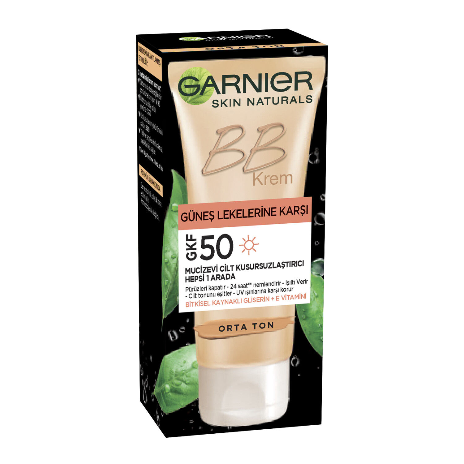 Günes lekesi karsıtı BB Krem Garnier Skin Naturals'tan ilk SPF/GKF50'ye sahip hepsi bir arada üründür. Mükemmel bir cilt görünümüne kavusmanızı saglar. Tek hareketle: -Pürüzleri kapatır -24 saat nemlendirir -Isıltı Verir -Cilt tonunu esitler -UV Isınlarına karsı korur - SPF/GKF 50