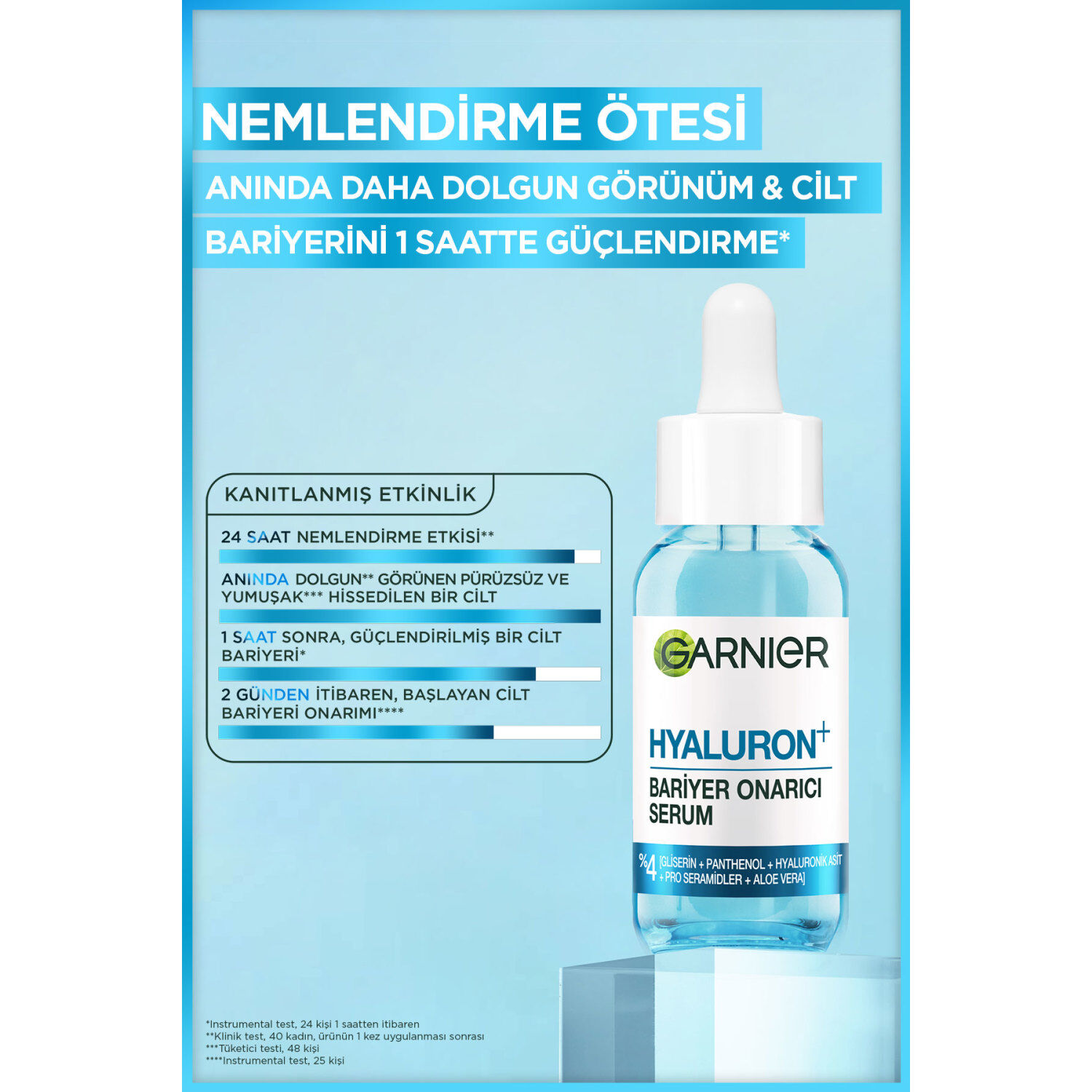 *Klinik çalışma, 40 gönüllü **Instrumental test, 24 gönüllü, 1 saatten itibaren ***Instrumental test, 25 gönüllü ****In vitro test, içerikler üzerinde *****Tüketici testi, 48 gönüllü