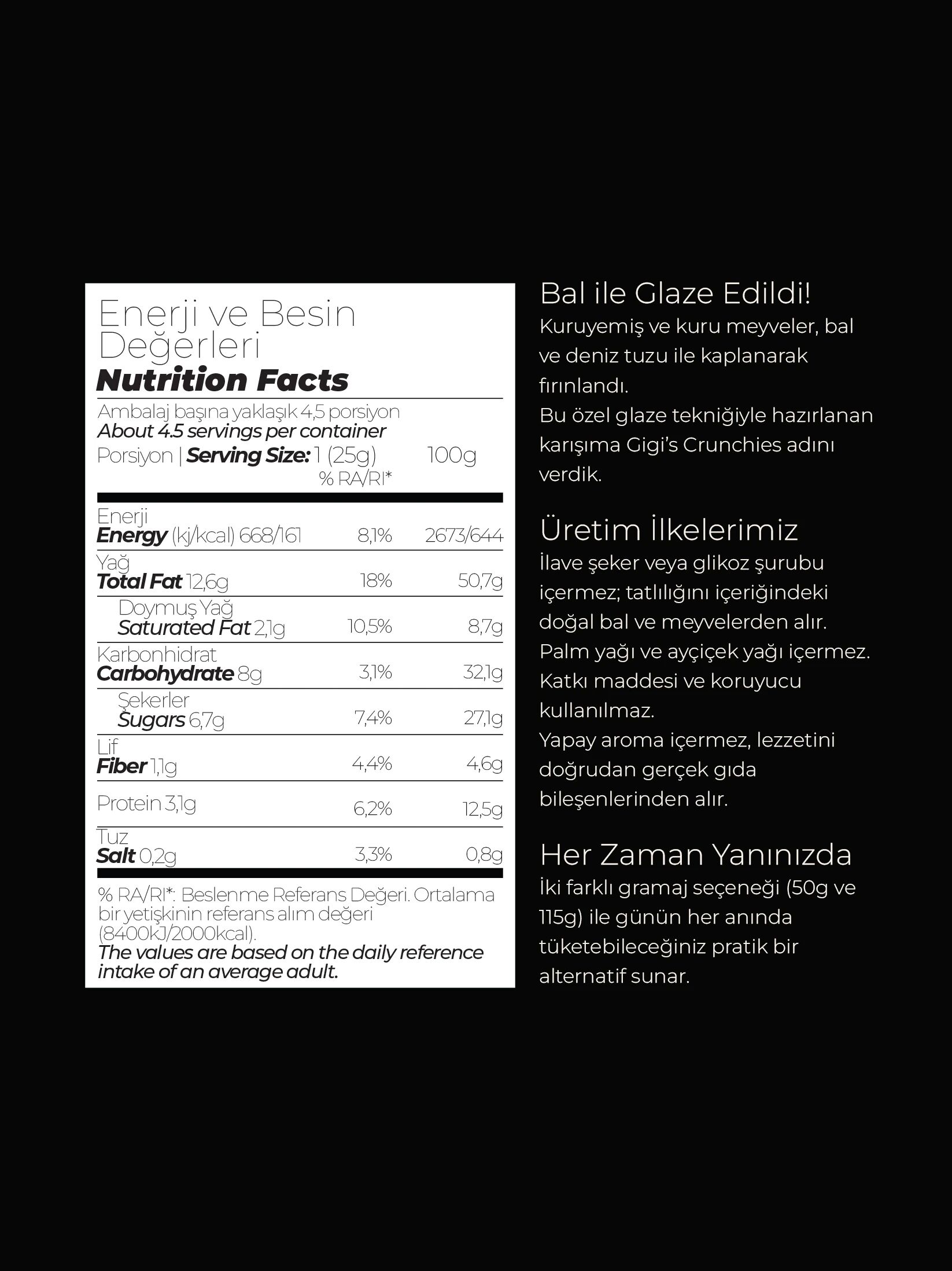 İçindekiler: Kurutulmuş elma, ceviz içi, bal, tarçın, rhodiola tozu ve Himalaya tuzu.