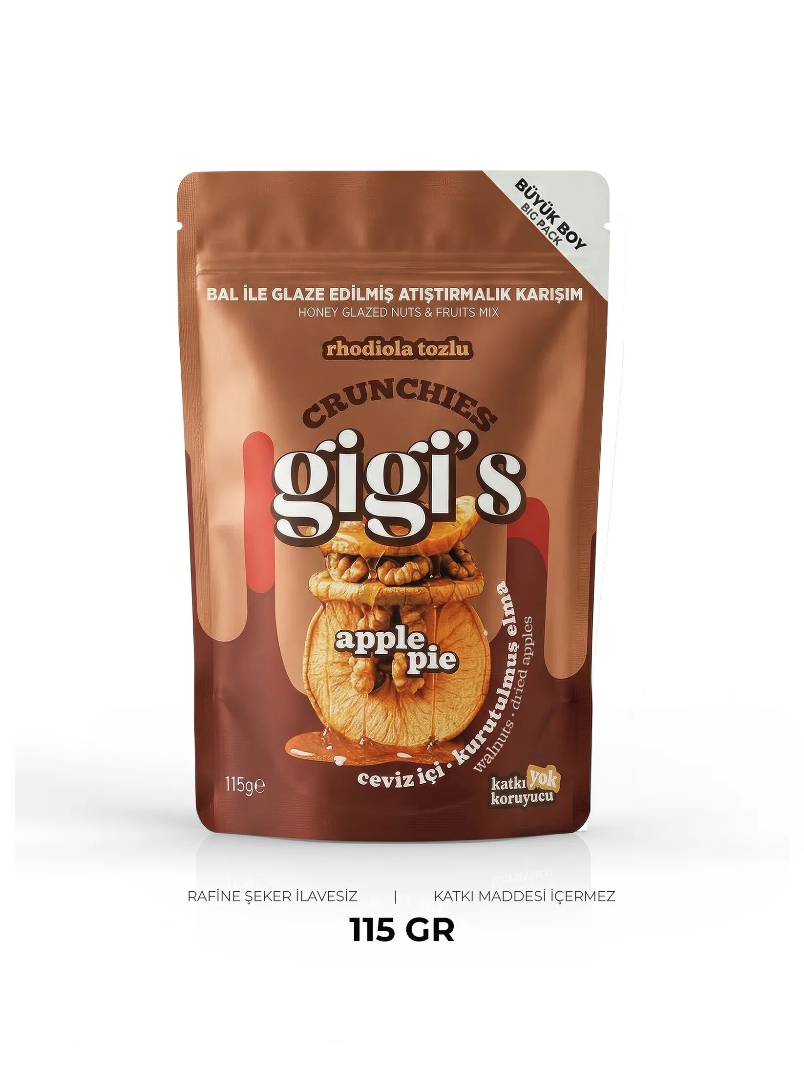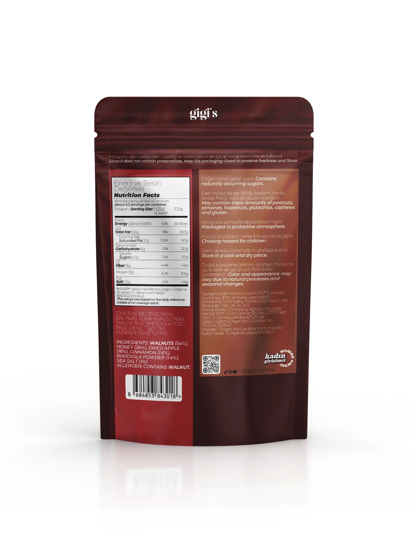 İçindekiler: Kurutulmuş elma, ceviz içi, bal, tarçın, rhodiola tozu ve Himalaya tuzu.