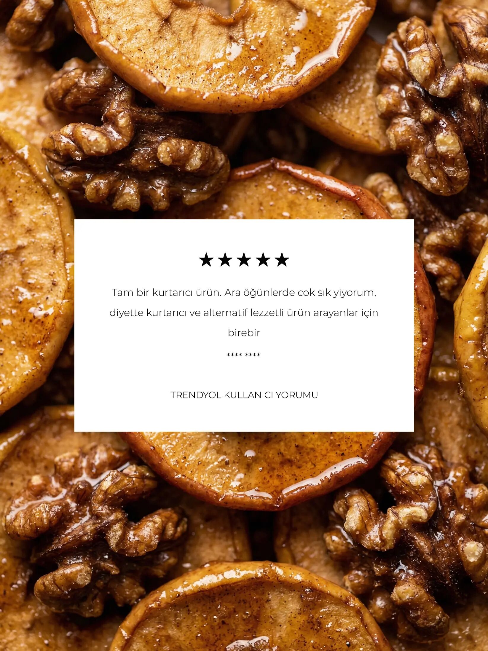 Kurutulmuş elma ve ceviz içi bal, tarçın ve deniz tuzu ile glaze edilir.
