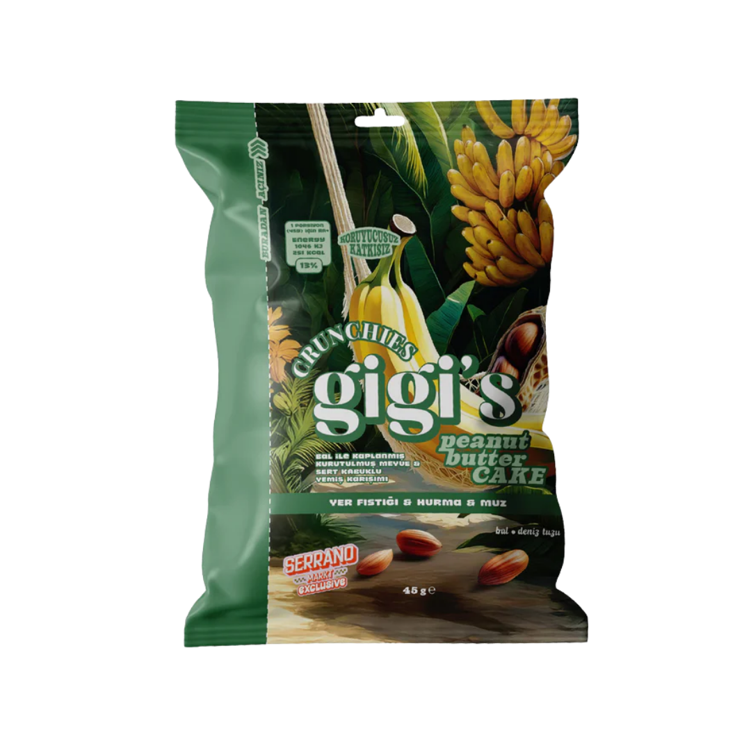 Gigi’s Crunchies serisi, doğanın sunduğu doğal içeriklerden ilham alır. “Peanut Butter Cake” versiyonunda ise yer fıstığı, muz ve hurma gibi besleyici içerikler kullanılarak dengeli ve tok tutan bir seçenek sunar.
