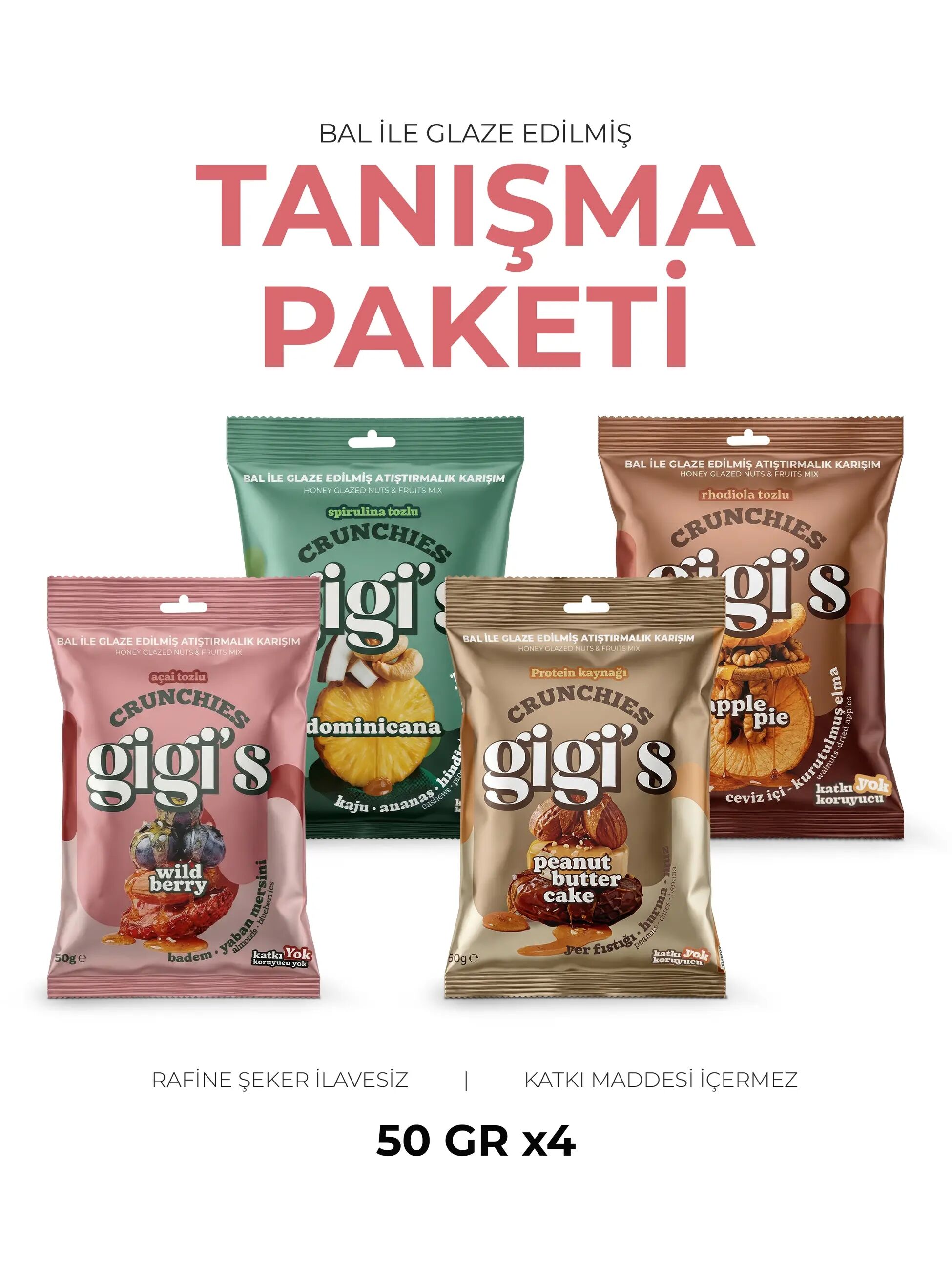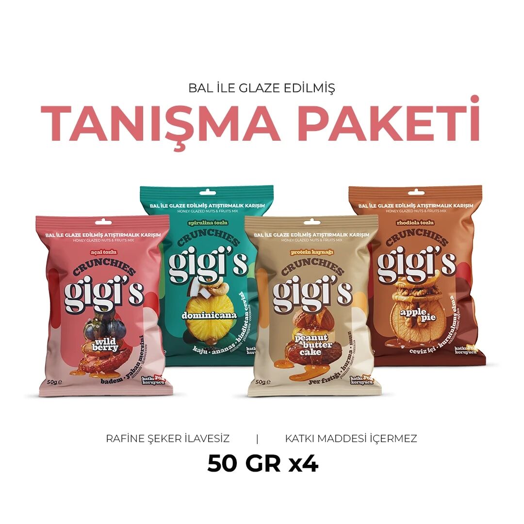 Bal ve deniz tuzu ile glaze edilmiş kuruyemiş ve kuru meyvelerden oluşan Gigi’s Crunchies Tanışma Paketi.