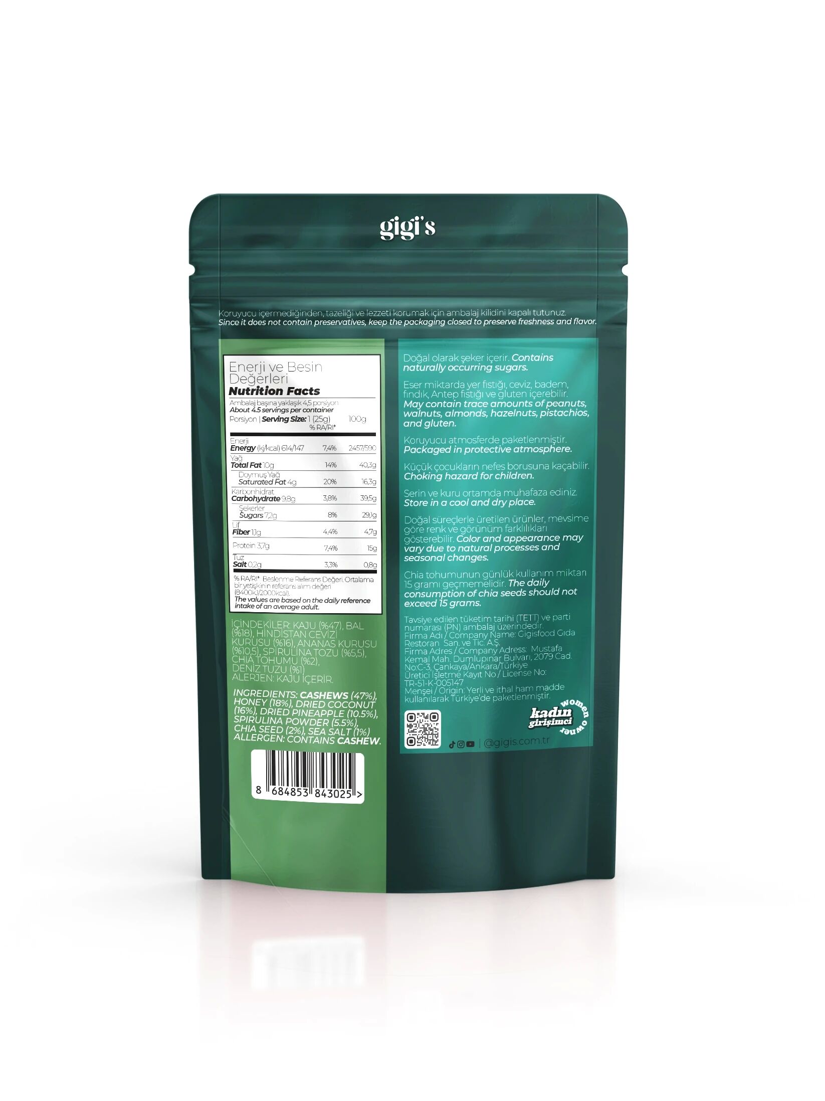 İçindekiler: Kaju, ananas kurusu, hindistan cevizi kurusu, bal, spirulina tozu, chia tohumu ve Himalaya tuzu.