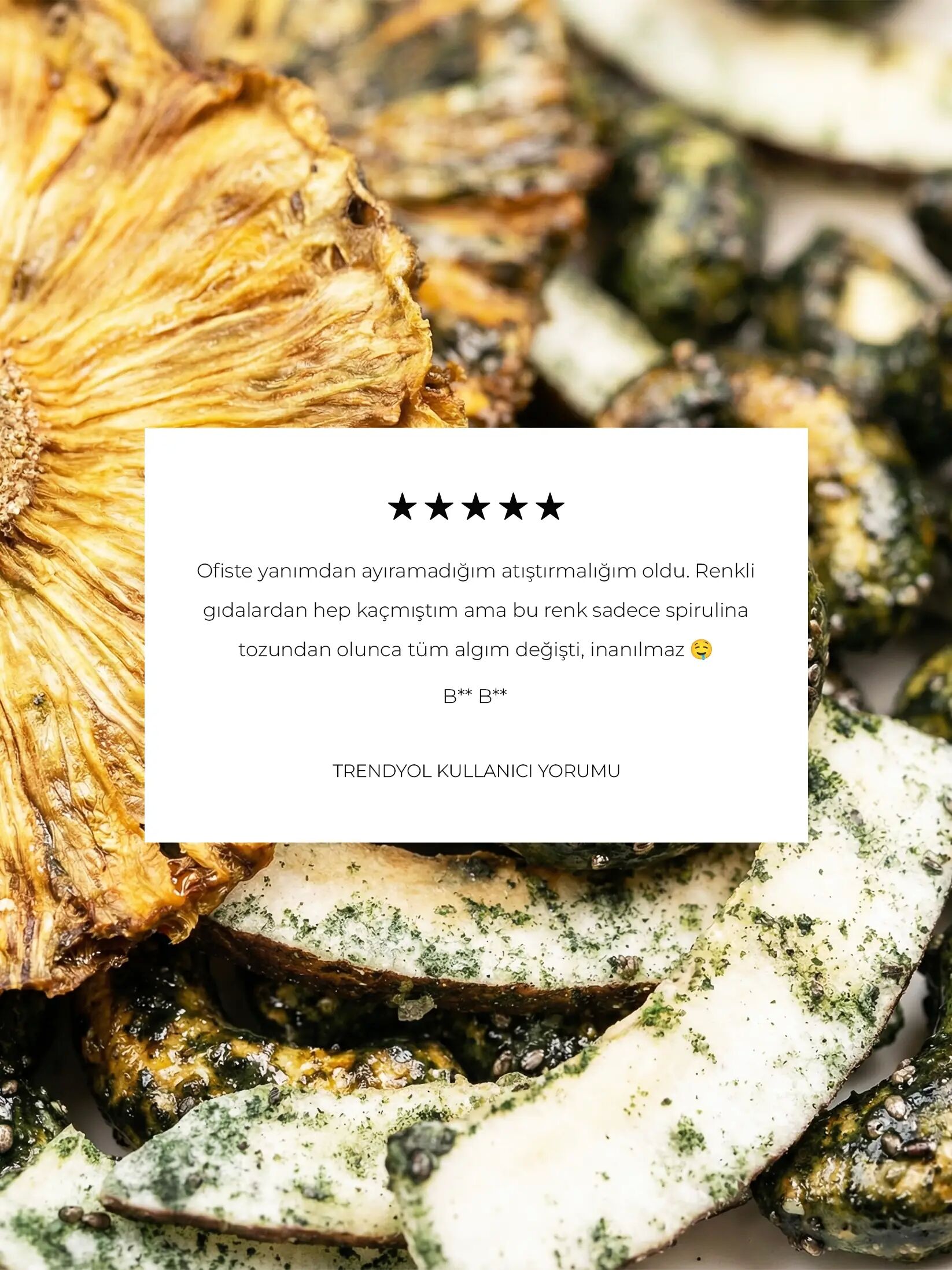 İçindekiler: Kaju, ananas kurusu, hindistan cevizi kurusu, bal, spirulina tozu, chia tohumu ve deniz tuzu.