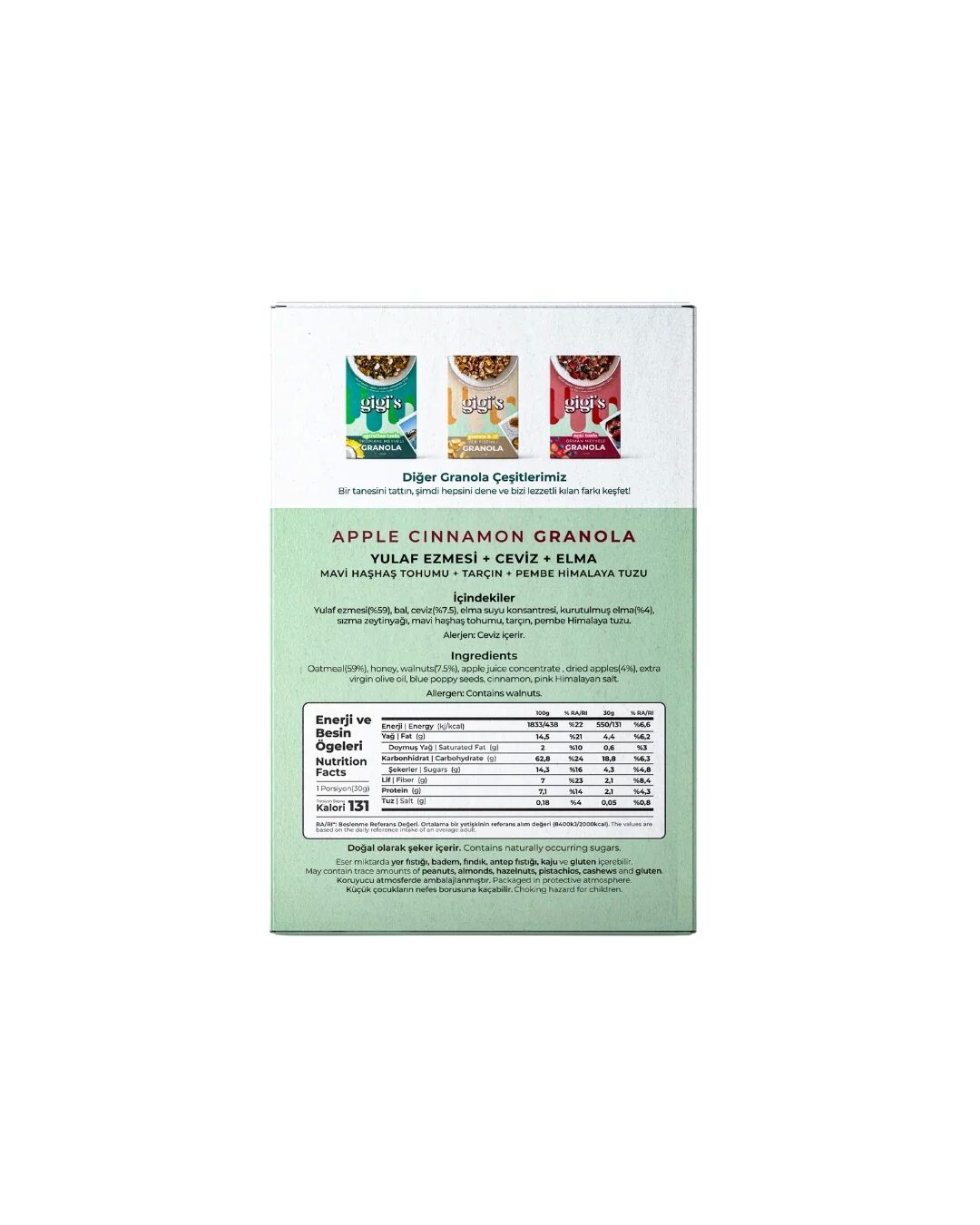 Elma ve tarçın kokusunun o nostaljik tadı, yıldız içeriği Mavi Haşhaş ile birleşti ve Gigi's Granola haline geldi. İkonik kombinasyonuyla Elmalı Tarçınlı Granola her anın favorisi olmaya hazır!