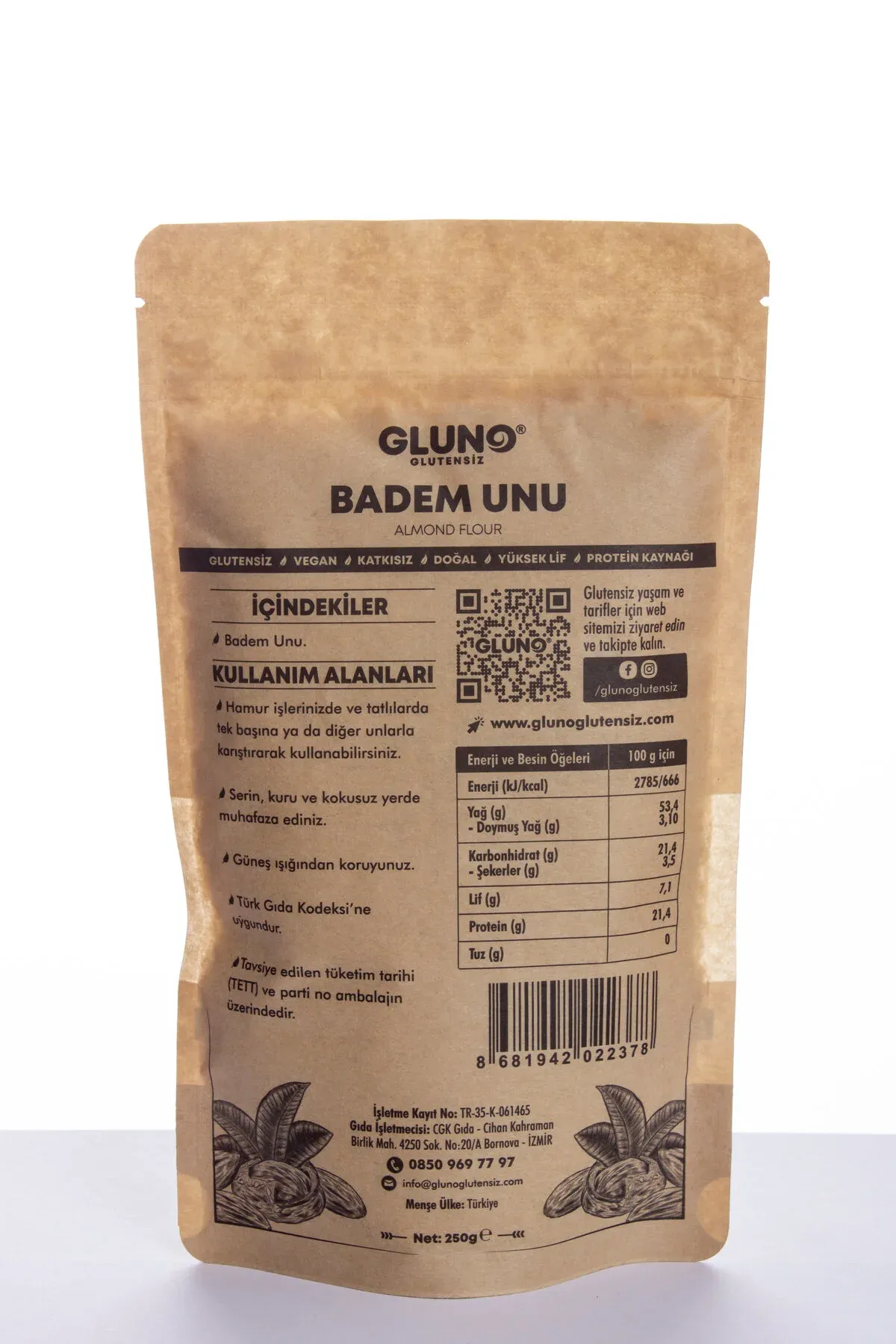 Gluno Glutensiz Badem Unu 250gr Tatlılardan tuzlu atıştırmalıklara kadar geniş bir yelpazede kullanabileceğiniz badem unu, mutfakta çok yönlü bir yardımcıdır. Gluten içermez. Paketlenen tesiste sadece glutensiz ürünler üretilmekte ve paketlenmektedir. Çapraz bulaşma yoktur. Vegan bir üründür. Kuru ve serin yerde, güneş ışığından uzakta muhafaza ediniz. Türk Gıda Kodeksine uygundur.