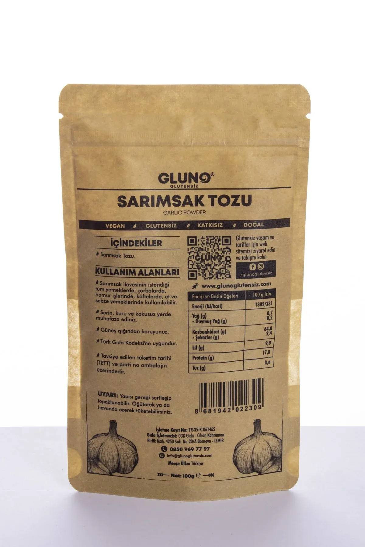 Gluno Glutensiz Sarımsak Tozu 100g Gluten içermez. Paketlenen tesiste sadece glutensiz ürünler üretilmekte ve paketlenmektedir. Çapraz bulaşma yoktur. Vegan bir üründür. Kuru ve serin yerde, güneş ışığından uzakta muhafaza ediniz. Türk Gıda Kodeksine uygundur. Menşei: Türkiye