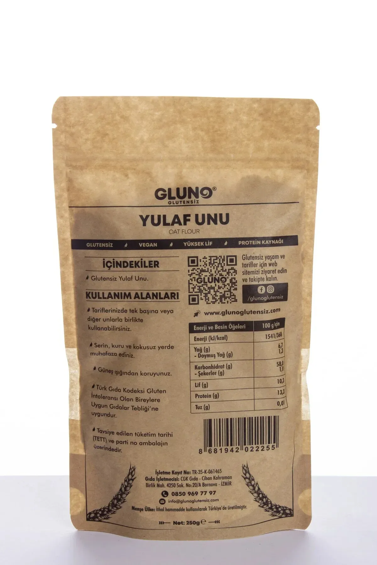 Gluno Glutensiz Yulaf Unu 250g Ekmek yapımında, hamur işlerinde, kek yapımında, ve çorbalarda kullanılabilir. Gluten içermez. Paketlenen tesiste sadece glutensiz ürünler üretilmekte ve paketlenmektedir. Çapraz bulaşma yoktur. Vegan bir üründür. Kuru ve serin yerde, güneş ışığından uzakta muhafaza ediniz. Türk Gıda Kodeksine uygundur. İthal hammadde kullanılarak Türkiye'de üretilmiştir.