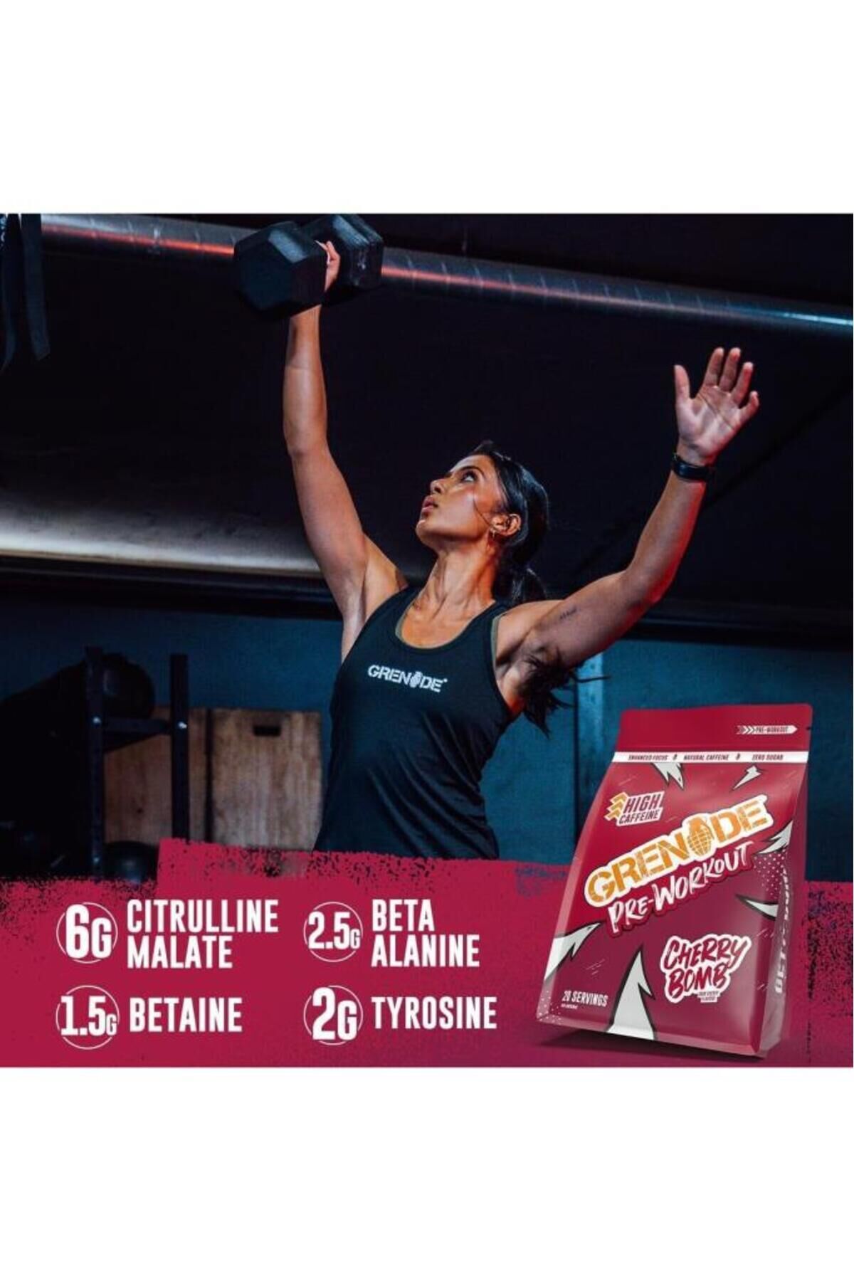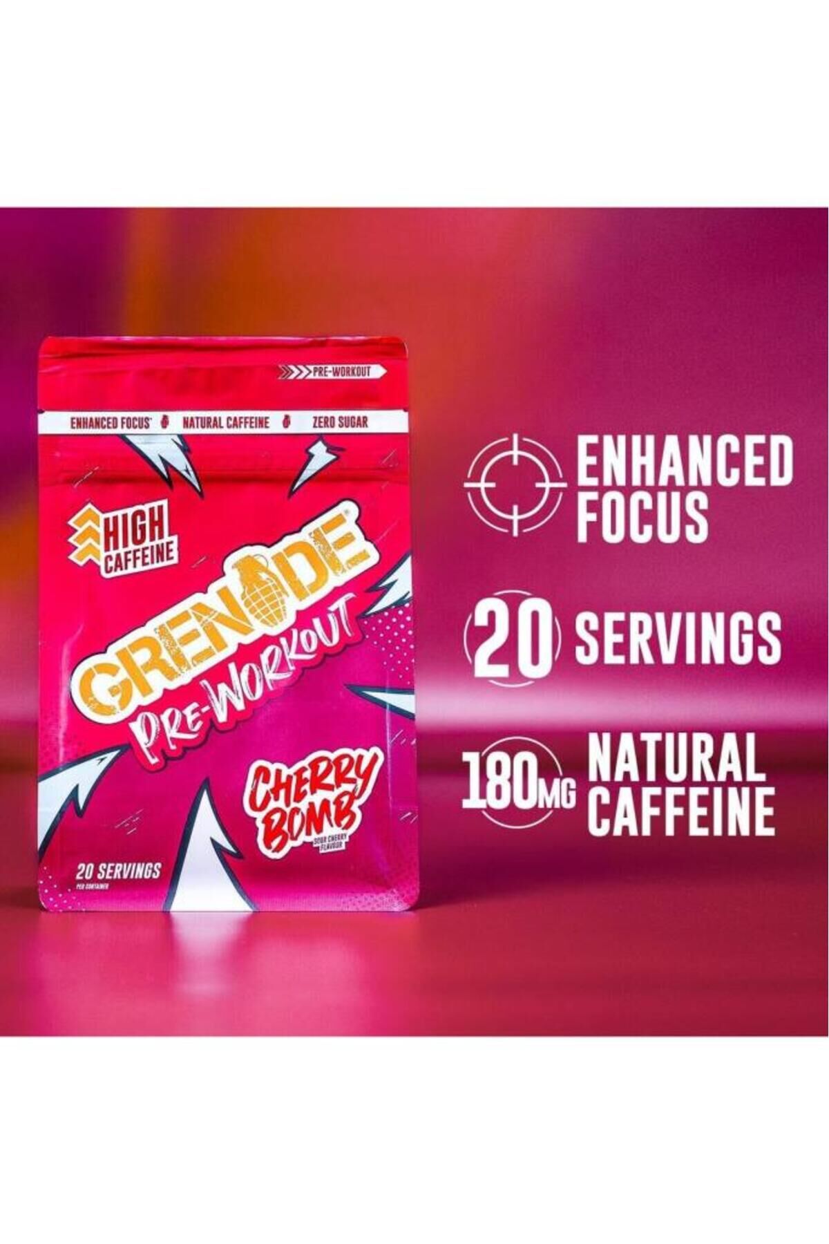 Grenade Pre-Workout Cherry Bomb 330 gr Grenade Preworkout 330 G Nedir? Grenade Preworkout, zengin formülüyle öne çıkan bir antrenman öncesi takviyesidir.; Grenade Preworkout içerisinde 90 mg kafeine ek olarak 185 mg magnezyum sitrat, 250 mg taurin, 2000 mg sitrülin, 1250 mg beta alanin, 1000 mg L-tirozin, 750 mg betain ve 25 mg Radiola ekstresi yer alır.; Lezzetli kiraz aroması sayesinde kolay bir tüketim imkanı sunar.; Grenade Preworkout 330 G Özellikleri: - Yüksek kafein oranı - Taurin, betain, sitrülin içeren formül - Rodiola ekstresi ilaveli - Toplam 40 servis
