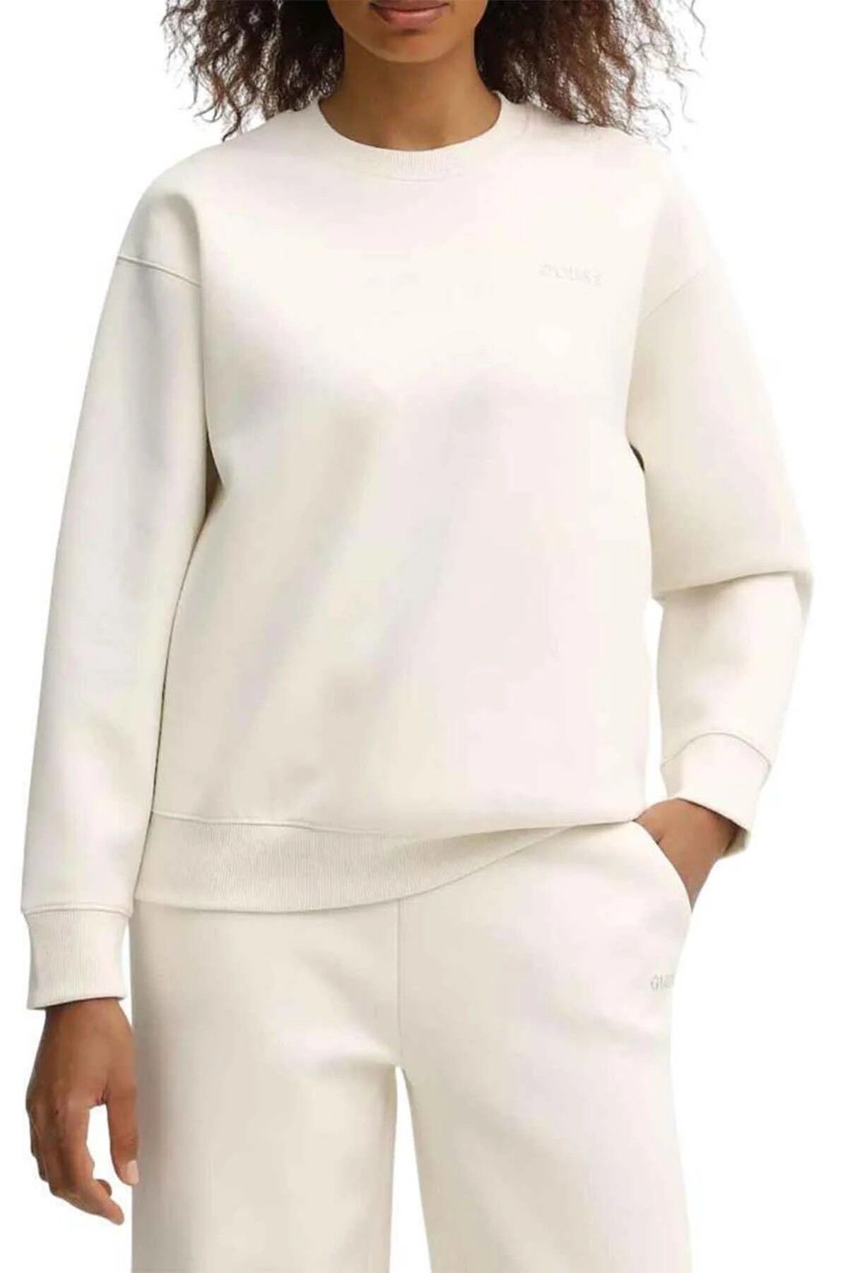 TANIM Guess marka bej renkli sweatshirt özellikler RENK: BEJ KOMPOZİSYONLAR: %69 Pamuk %26 Polyester %5 Elastan/Spandex MEVSİM: SONBAHAR-KIŞ 25/26 TULUM: KAZAK