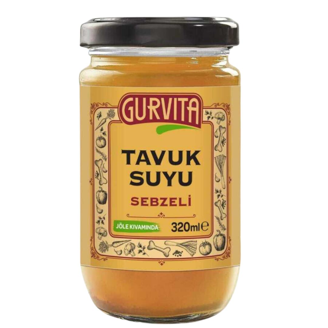 Sebzeli Tavuk Suyu ( %99,95 ) (Tavuk eti, tavuk kemiği, soğan, havuç, kereviz sapı , sarımsak, maydanoz, limon, defne yaprağı, zencefil, biberiye, tane karabiber, doğal kaynak tuzu, su ) Gurvita organik elma sirkesi.