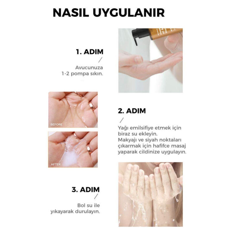 • Sonrasında elinizi ıslatın süt kıvamına gelen yağ ile makyajı ve siyah noktaları çıkarmak içi hafifçe masaj yaparak cildinize uygulayın.