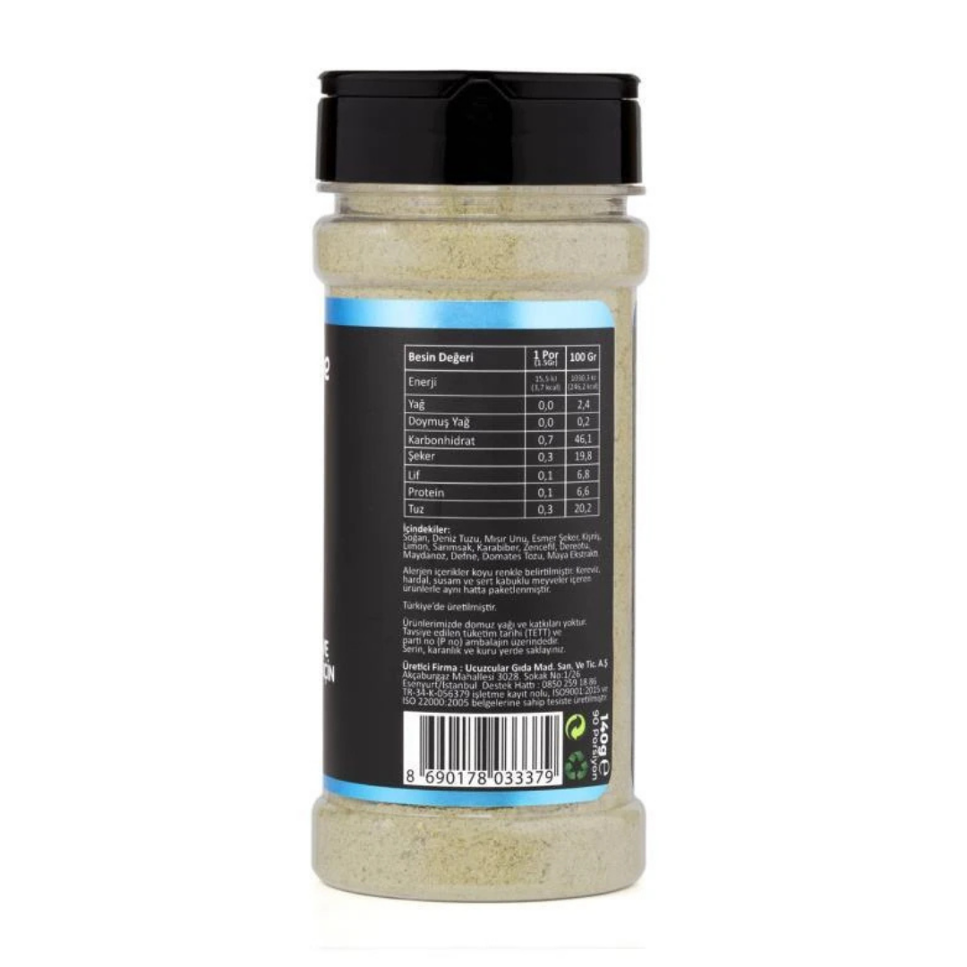 İçindekiler : Soğan, Deniz Tuzu, Mısır Unu, Esmer Şeker, Kişniş, Limon, Sarımsak, Karabiber, Zencefil, Dereotu, Maydanoz, Defne, Domates Tozu, Maya Ekstraktı.