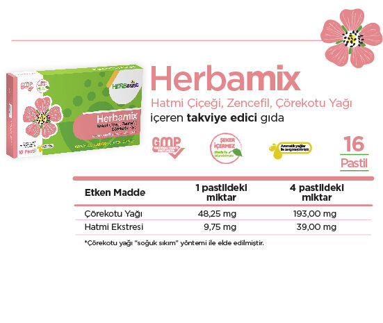 Herbamix, içeriğindeki hatmi çiçeği ekstersi, ağız içi veya boğaz tahrişini ve buna bağlı oluşan kuru öksürüğü tedavi etmede destekleyicidir. Solunum yolundaki mukozanın daha hızlı yenilenmesine katkıda bulunur. Antioksidan etki gösterir. İçerdiği çörekotu yağı, boğaz gıcıklanmasını önler ve solunum yollarında bağışıklık sistemini destekler.