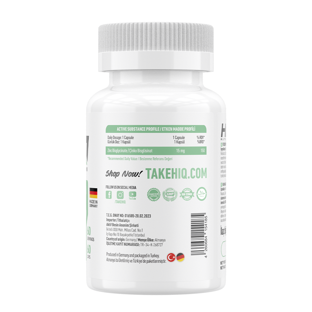 HIQ Çinko Kapsül, her kapsülde 15 mg çinko içerir. Takviye edici gıdalar normal beslenmenin yerine geçmez.